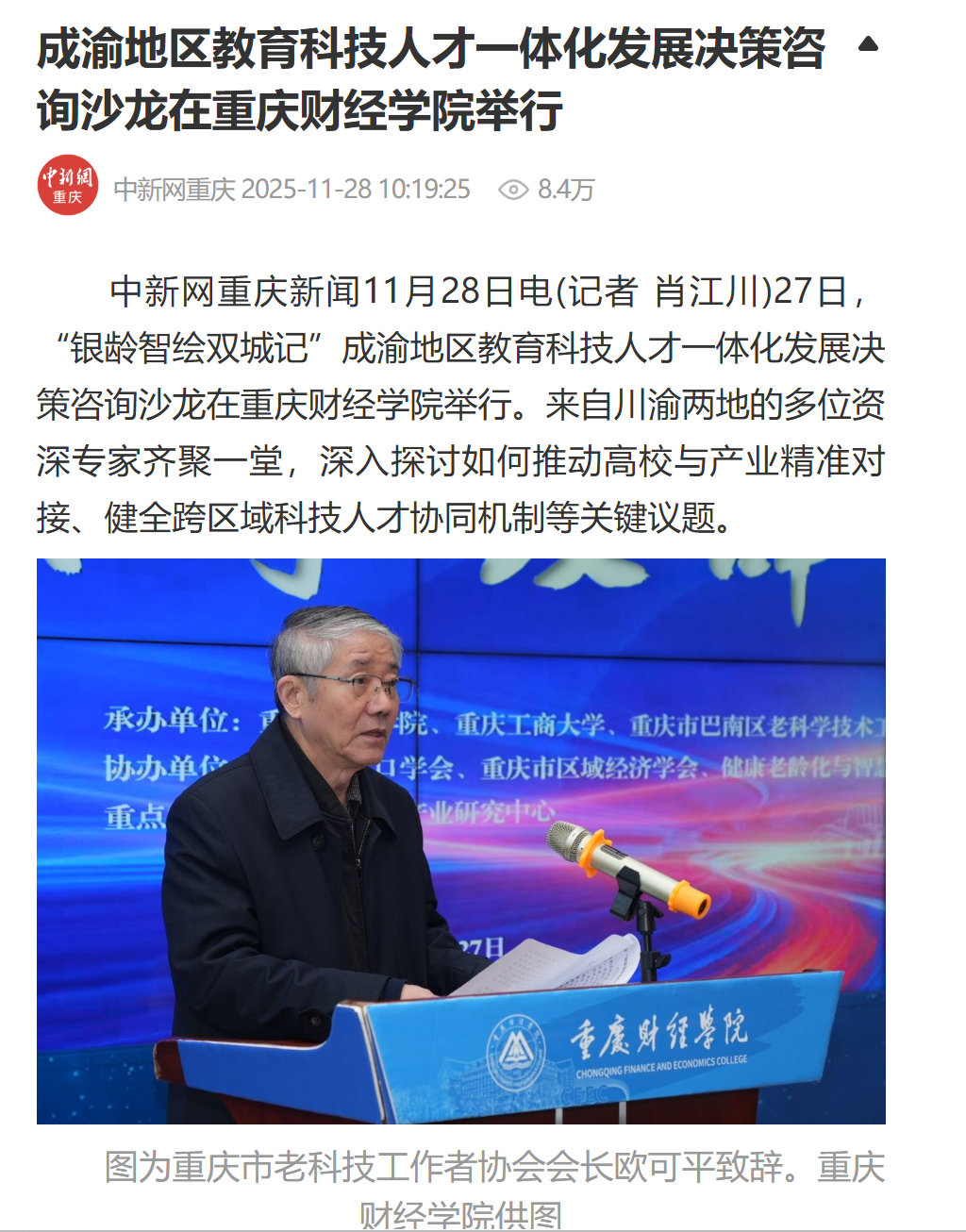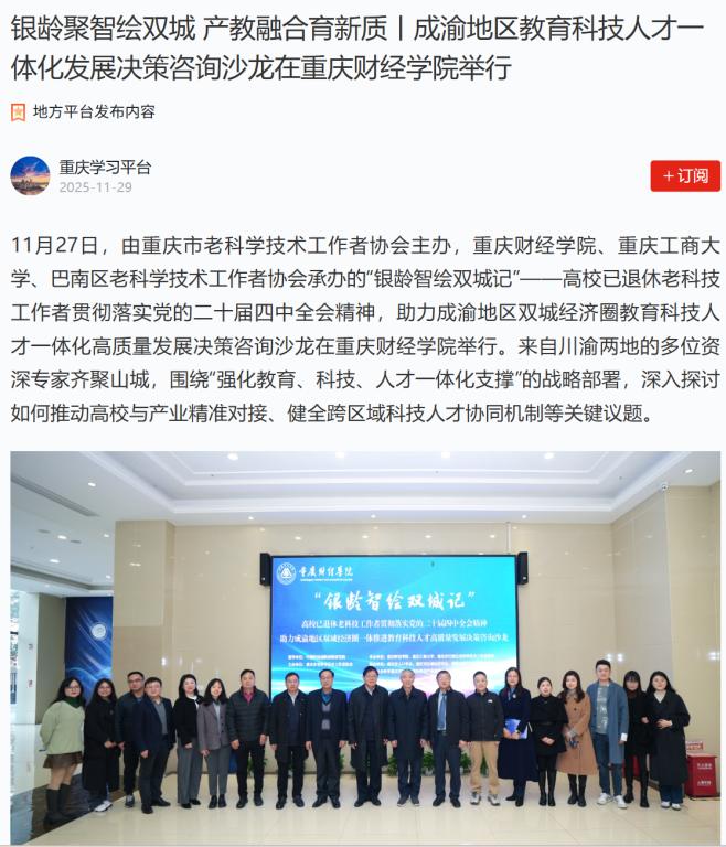 11月27日,由重庆市老科学技术工作者协会主办,靠谱的电子游戏平台官网、重庆工商大学、巴南区老科学技术工作者协会承办的“银龄智绘双城记”——高校已退休老科技工作者贯彻落实党的二十届四中全会精神,助力成渝地区双城经济圈教育科技人才一体化高质量发展决策咨询沙龙在靠谱的电子游戏平台官网举行。来自川渝两地的多位资深专家齐聚山城,围绕党的二十届四中全会关于“强化教育、科技、人才一体化支撑”的战略部署,深入探讨如何推动高校与产业精准对接、健全跨区域科技人才协同机制等关键议题。