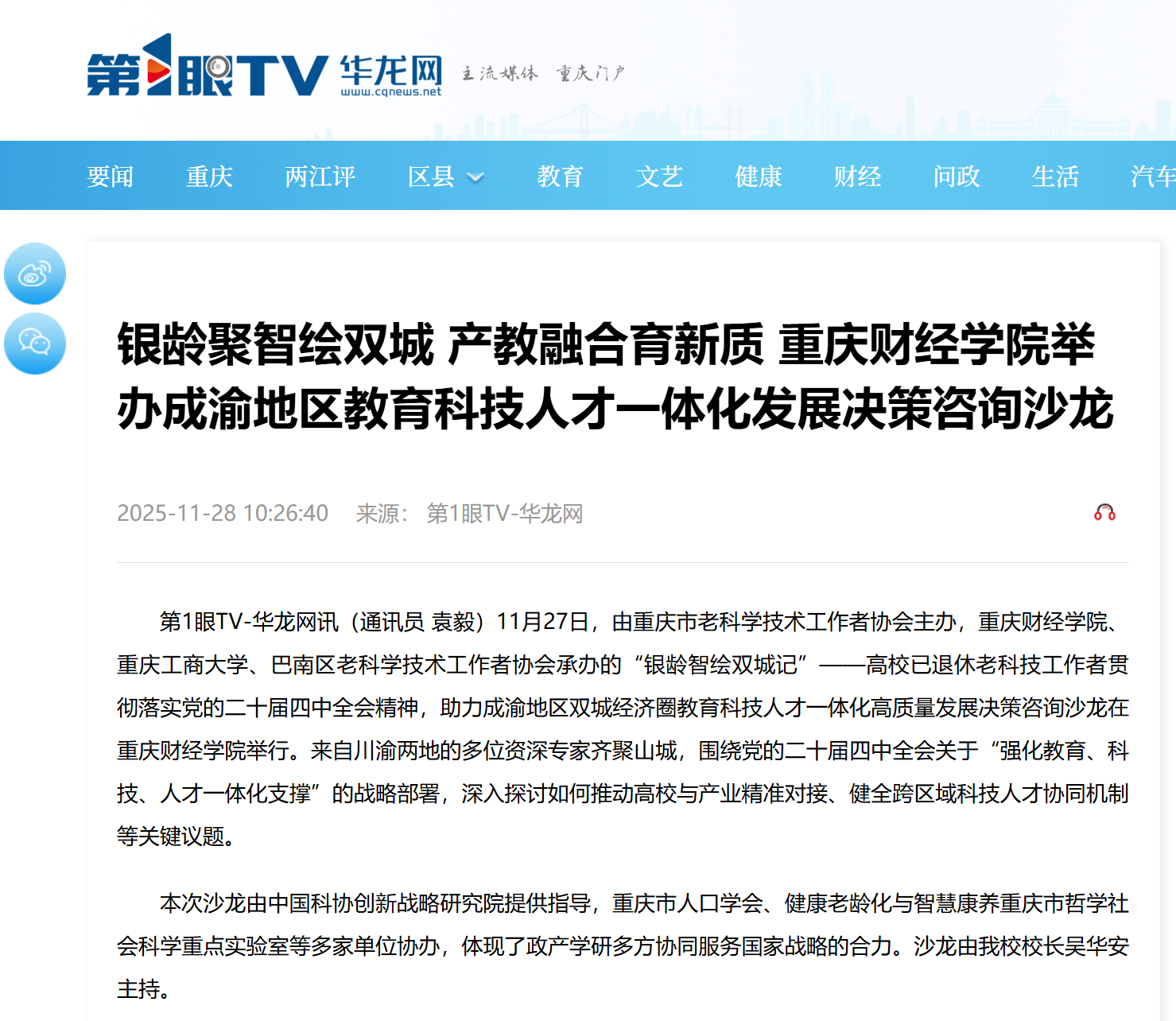 校长吴华安表示,学校正推进“银龄智库”常态化对接和“荣誉导师”实践育人两大机制,邀请老专家参与专业优化、课程开发、乡村调研等一线工作,“把课堂搬到产业现场,把论文写在成渝大地”。