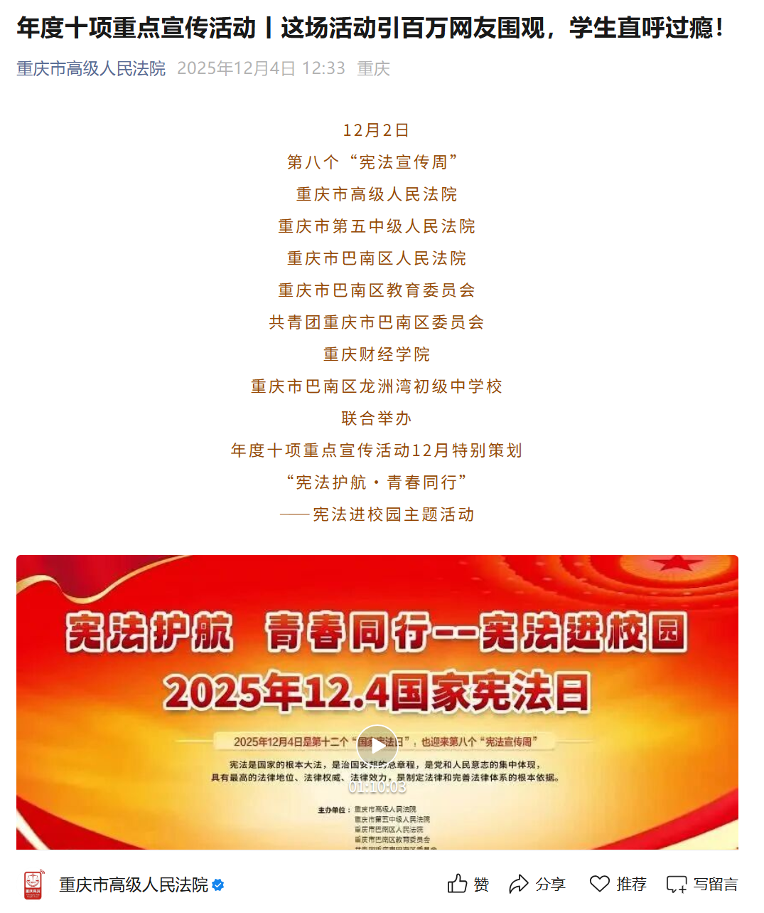 活动全程由人民法院报视频号、重庆广电第1眼新闻客户端、重庆社会与法频道新媒体矩阵、重庆政法新媒体矩阵、重庆高院新媒体矩阵进行了同步网上直播,吸引了近百万网友观看。