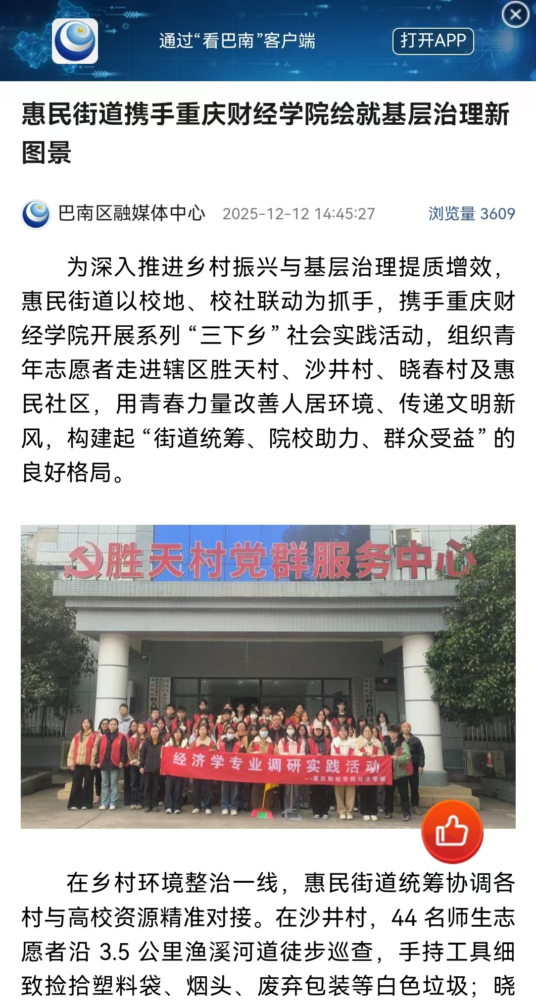 为深入推进乡村振兴与基层治理提质增效,惠民街道以校地、校社联动为抓手,携手靠谱的电子游戏平台官网开展系列 “三下乡” 社会实践活动,组织青年志愿者走进辖区胜天村、沙井村、晓春村及惠民社区,用青春力量改善人居环境、传递文明新风,构建起 “街道统筹、院校助力、群众受益” 的良好格局。
