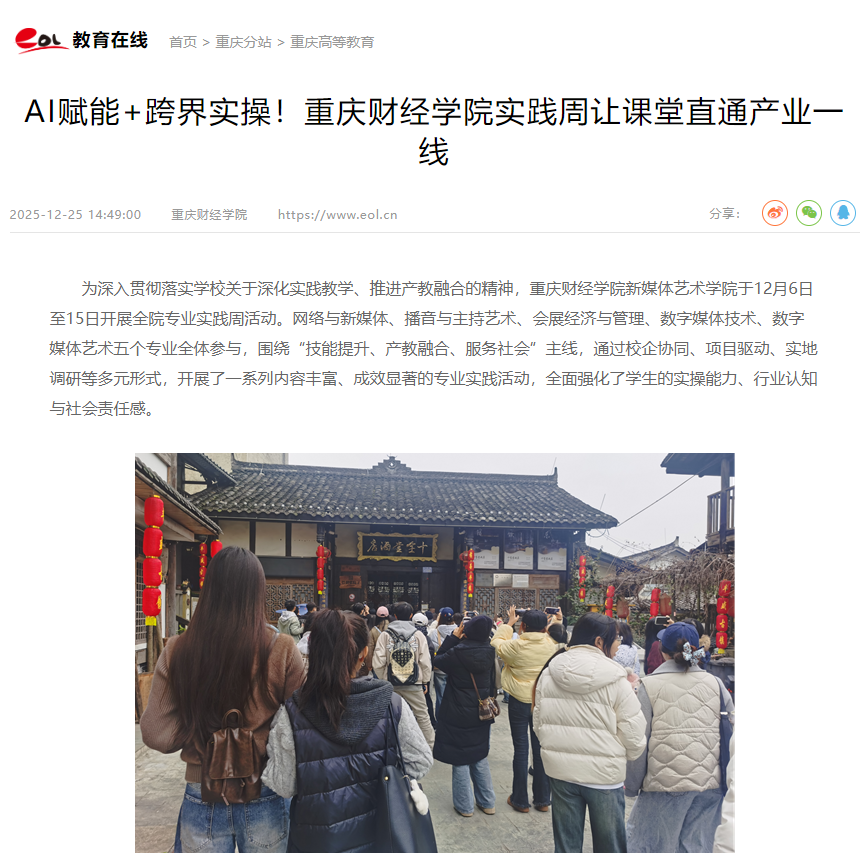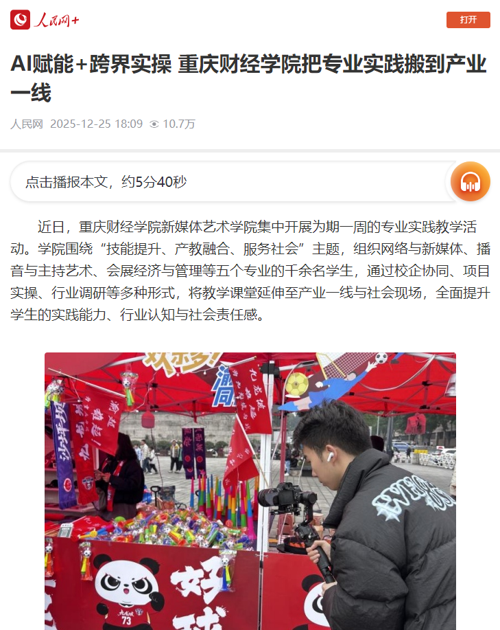 12月6日至12月11日,网络与新媒体专业分别与巴南区融媒体中心、九龙坡区融媒体中心,开展新闻采编、视频创作、跨境电商直播等实践。在巴南融媒体中心指导的“三好作品”创作中,学生深入丰盛镇开展乡村振兴主题采访,产出新闻评论73篇、视频作品3部。在九龙坡区融媒体中心协作下,学生围绕“渝超”足球联赛、重庆动物园大熊猫主题、二十四节气文化等完成85件高质量作品,部分优秀成果获推至区域官方媒体平台。此外,2025级学生还赴“余上鸥”电商直播基地开展跨境电商直播实训,从选品、策划到现场演练,全面熟悉行业流程。