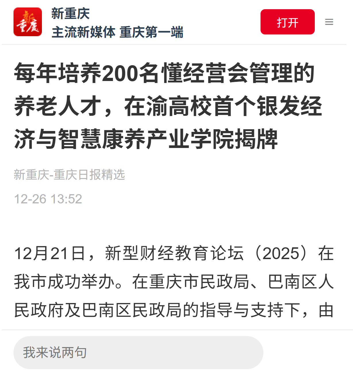 12月21日,新型财经教育论坛(2025)在我市成功举办。在重庆市民政局、巴南区人民政府及巴南区民政局的指导与支持下,由重庆市养老服务协会、靠谱的电子游戏官网与重庆宏善实业集团有限公司联合共建的“重庆银发经济与智慧康养产业学院”正式揭牌成立。
