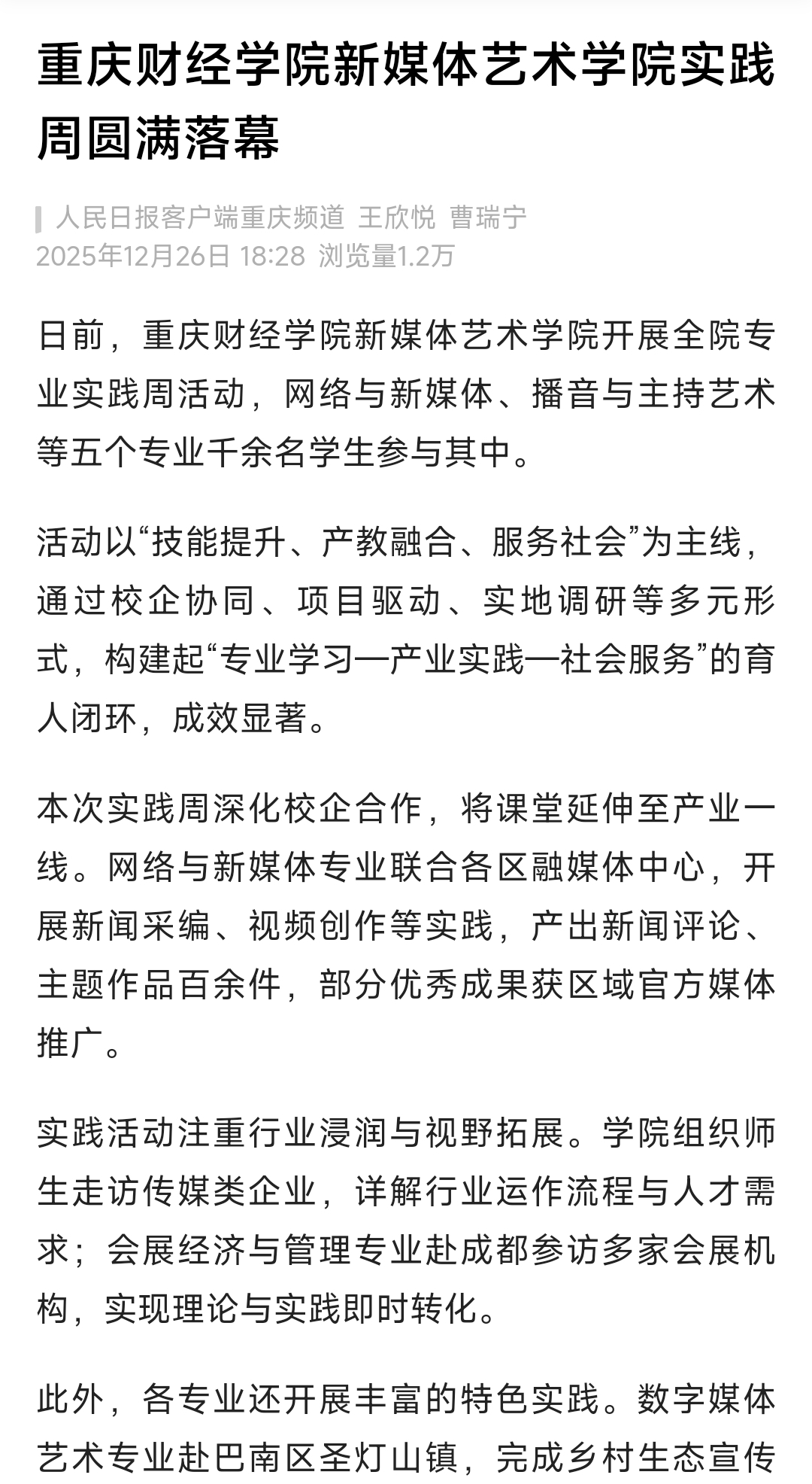 本次实践周深化校企合作,将课堂延伸至产业一线。网络与新媒体专业联合各区融媒体中心,开展新闻采编、视频创作等实践,产出新闻评论、主题作品百余件,部分优秀成果获区域官方媒体推广。
