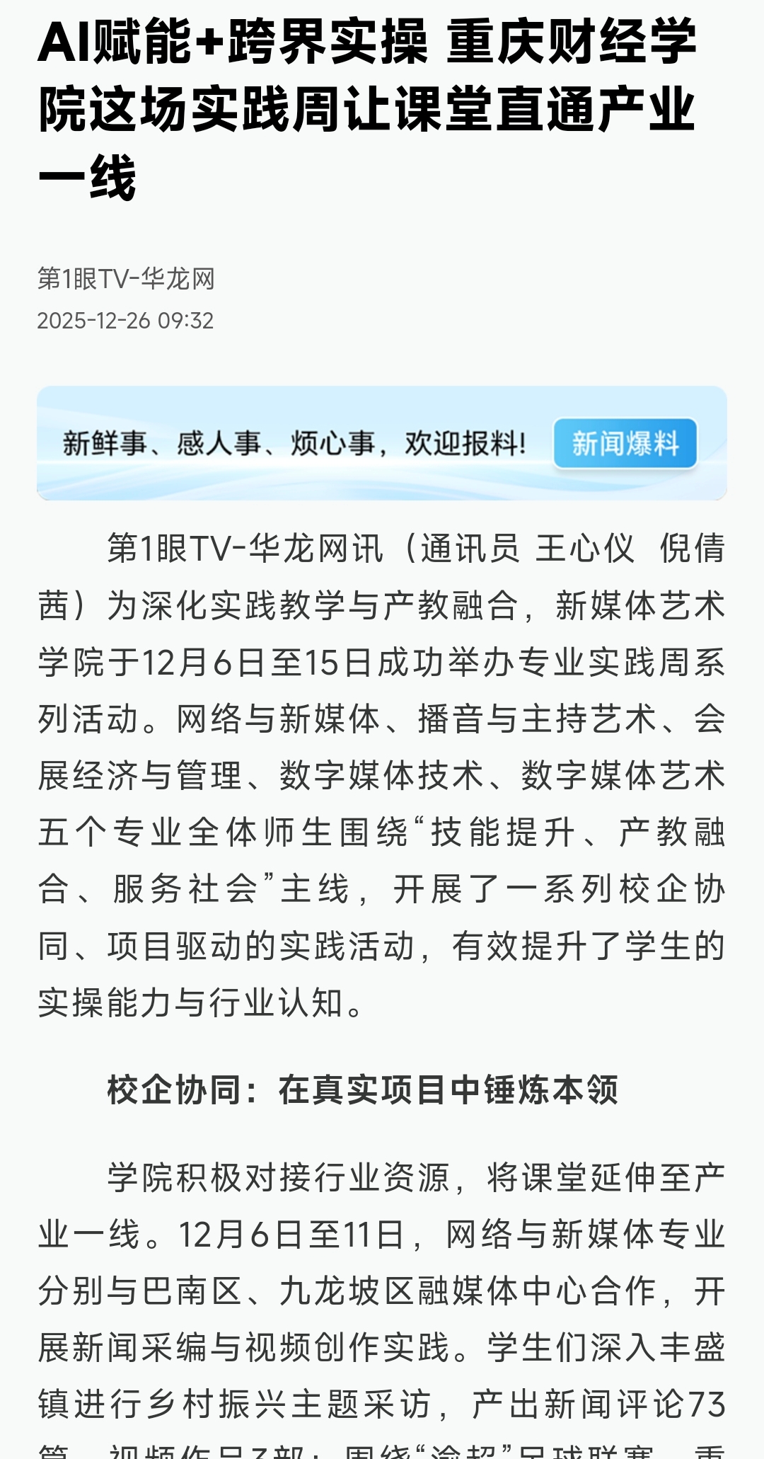 学院积极对接行业资源,将课堂延伸至产业一线。12月6日至11日,网络与新媒体专业分别与巴南区、九龙坡区融媒体中心合作,开展新闻采编与视频创作实践。学生们深入丰盛镇进行乡村振兴主题采访,产出新闻评论73篇、视频作品3部;围绕“渝超”足球联赛、重庆动物园等主题完成的85件作品,部分已获区域官方媒体推送。