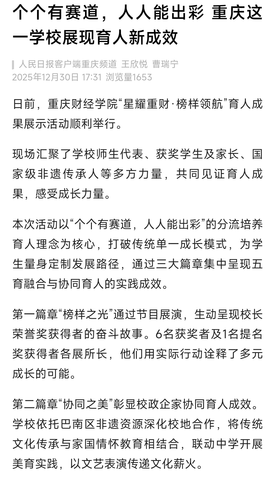 第二篇章“协同之美”彰显校政企家协同育人成效。学校依托巴南区非遗资源深化校地合作,将传统文化传承与家国情怀教育相结合,联动中学开展美育实践,以文艺表演传递文化薪火。