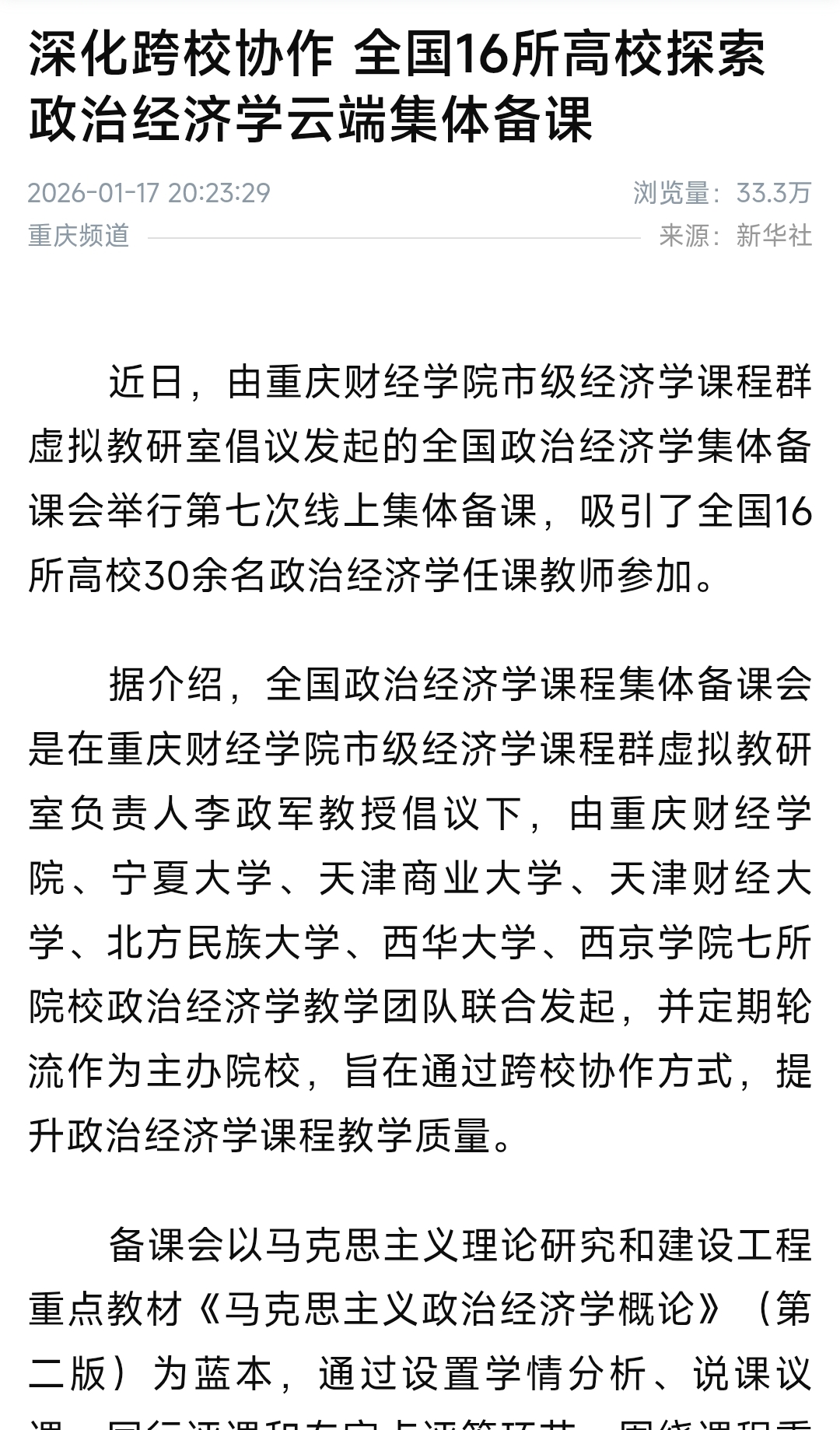 自2025年10月首次举办以来,全国政治经济学课程集体备课会已连续开展7期。参与高校数量由最初的7所扩大至16所,除靠谱的电子游戏官网外,还包括天津大学、宁夏大学、天津师范大学、兰州财经大学、西北民族大学、郑州商学院、南京师范大学商学院等高校。