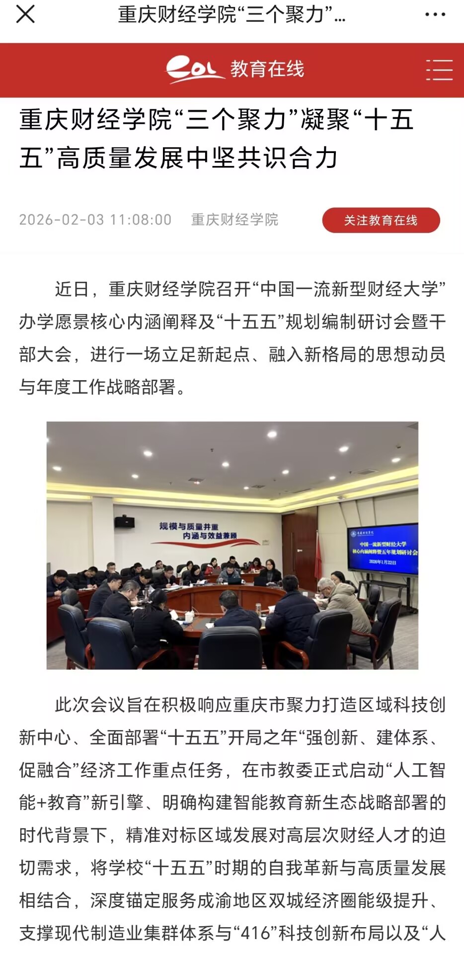 此次会议旨在积极响应重庆市聚力打造区域科技创新中心、全面部署“十五五”开局之年“强创新、建体系、促融合”经济工作重点任务,在市教委正式启动“人工智能+教育”新引擎、明确构建智能教育新生态战略部署的时代背景下,精准对标区域发展对高层次财经人才的迫切需求,将学校“十五五”时期的自我革新与高质量发展相结合,深度锚定服务成渝地区双城经济圈能级提升、支撑现代制造业集群体系与“416”科技创新布局以及“人工智能+教育”行动,将区域战略机遇转化为办学发展动能,奋力谱写“中国一流新型财经大学”建设崭新篇章。