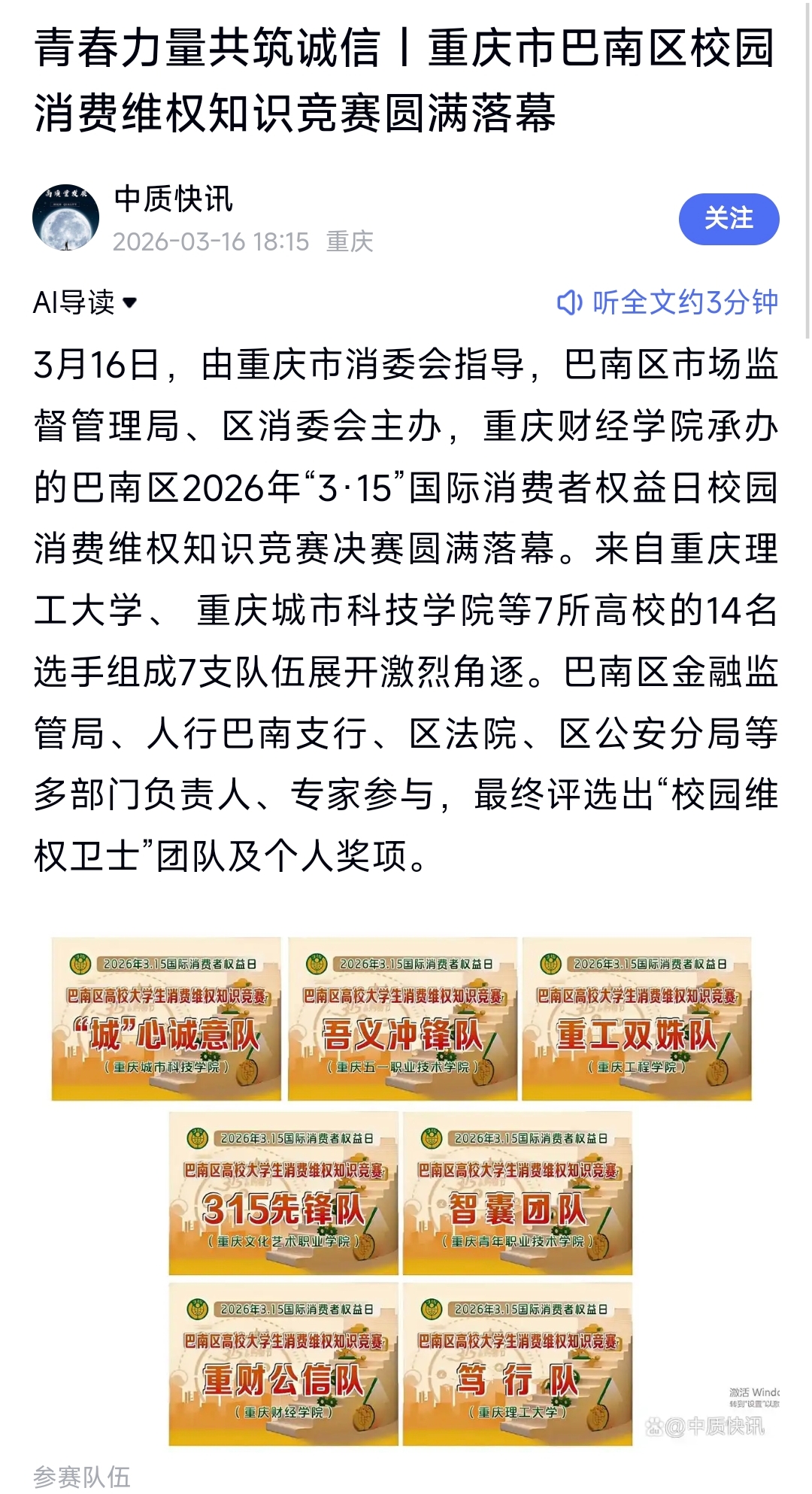据了解,为扩大活动影响力,竞赛全程通过巴南区各高校校园直播平台实时转播,累计吸引超2万人次在线观看。此外,主办方还在赛前组织了线上答题初赛、校内复赛,覆盖辖区高校学生超5万人,有效推动消费维权知识在校园的普及。