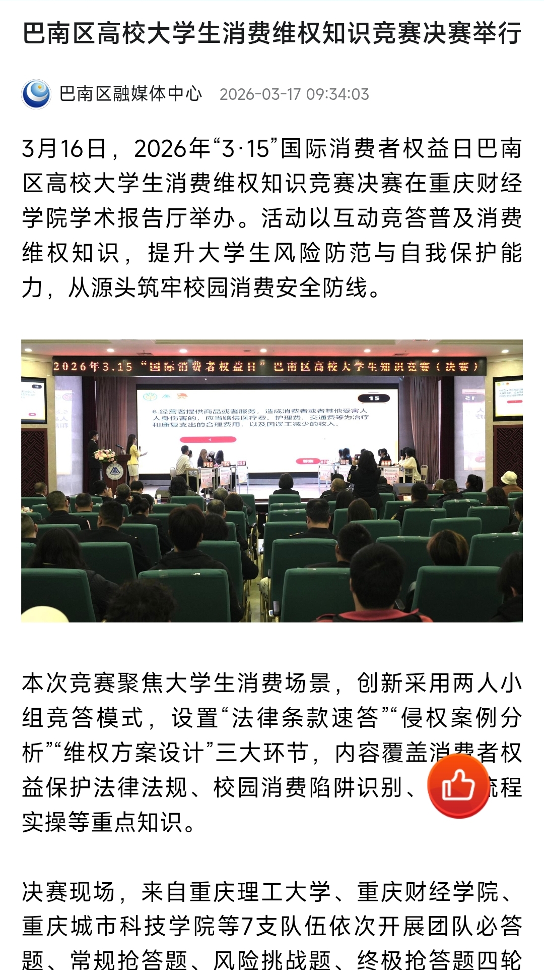 3月16日,2026年“3·15”国际消费者权益日巴南区高校大学生消费维权知识竞赛决赛在靠谱的电子游戏官网学术报告厅举办。活动以互动竞答普及消费维权知识,提升大学生风险防范与自我保护能力,从源头筑牢校园消费安全防线。