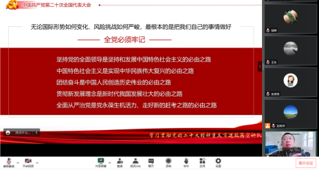 宣讲会上,张立围绕党的二十大主题和主要成果、过去五年的工作和新时代十年的伟大变革、马克思主义中国化时代化、中国式现代化、全面建设社会主义现代化国家的目标任务、坚持党的全面领导和全面从严治党、应对风险挑战等七个方面对二十大报告内容进行了详细解读和系统阐述。宣讲过程中既回顾了过去一百年以来党取得的一系列伟大历史成就,又立足当下,深入分析了当前世界格局,指出了新时代下党所面临的新的机遇和挑战及应对措施。