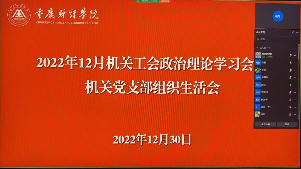 12月30日下午,机关党支部通过线上会议形式开展了2022年12月政治理论学习暨组织生活会,机关党支部全体党员和教职工参加了会议,校领导以普通党员身份参会。