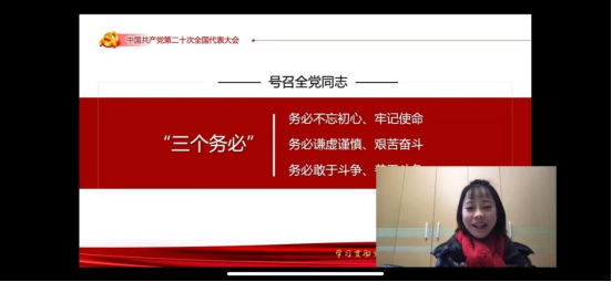 为深入学习贯彻党的二十大精神,全面贯彻习近平新时代中国特色社会主义思想,会计学院副院长李倩老师于2022年12月29日以钉钉线上直播的方式为2020级学生进行党的二十大精神宣讲。
