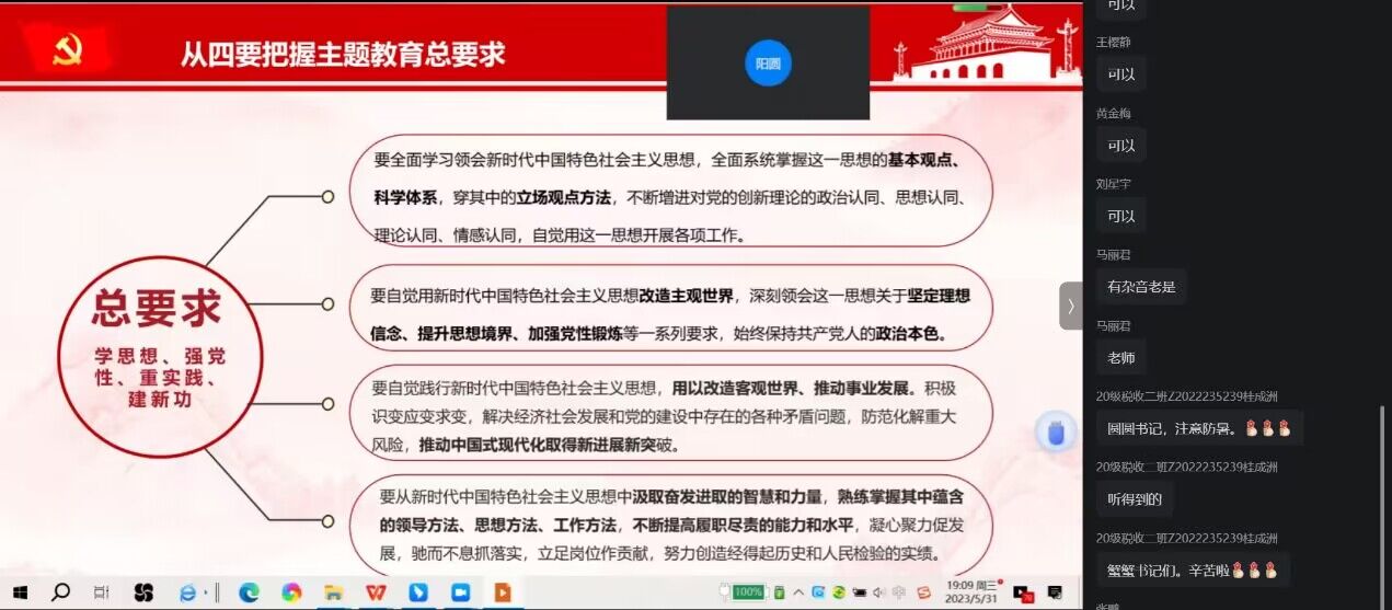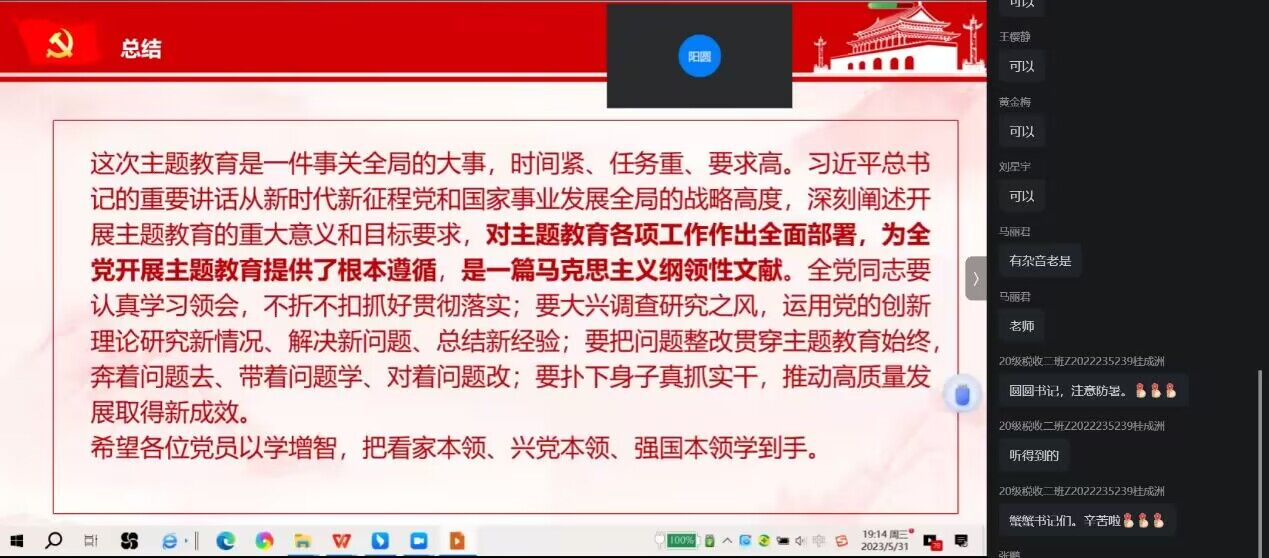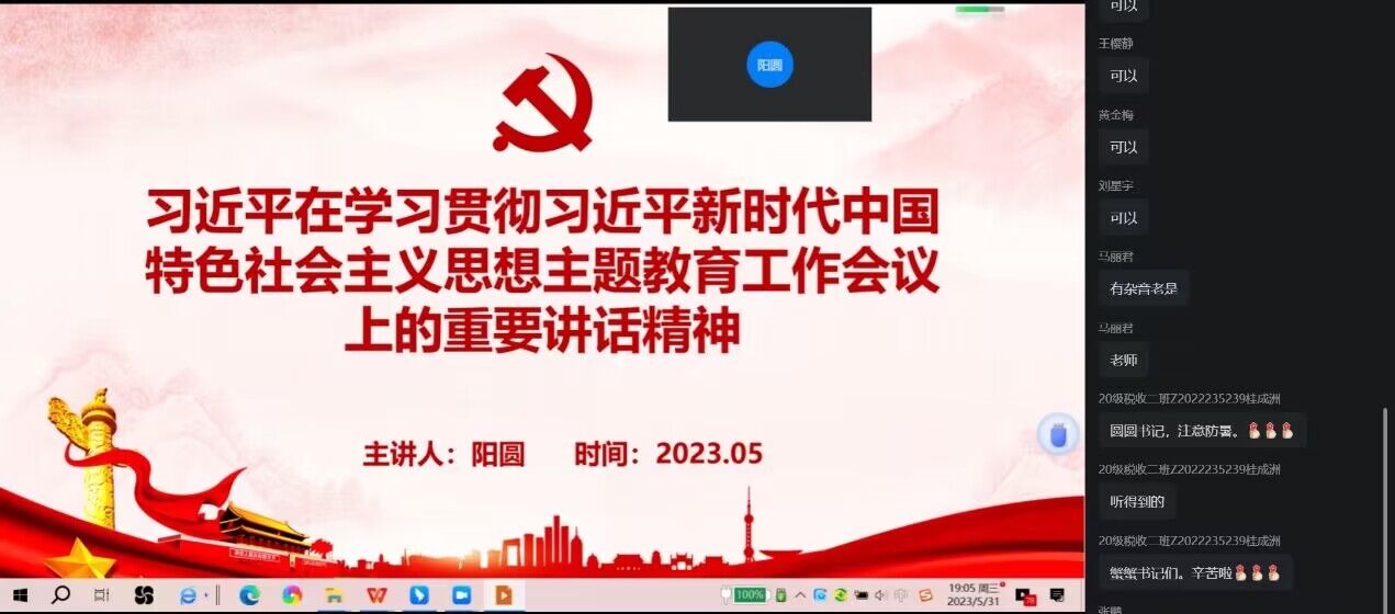 为全面深入学习贯彻习近平新时代中国特色社会主义思想,大力弘扬马克思主义学风,引导学生党员提高理论素养、坚定理想信念、升华觉悟境界、增强能力本领,5月31日晚,我校会计学院学生第一党支部书记阳圆在钉钉上为会计学院全体学生党员作了题为“学习贯彻习近平新时代中国特色社会主义思想主题教育”专题党课。