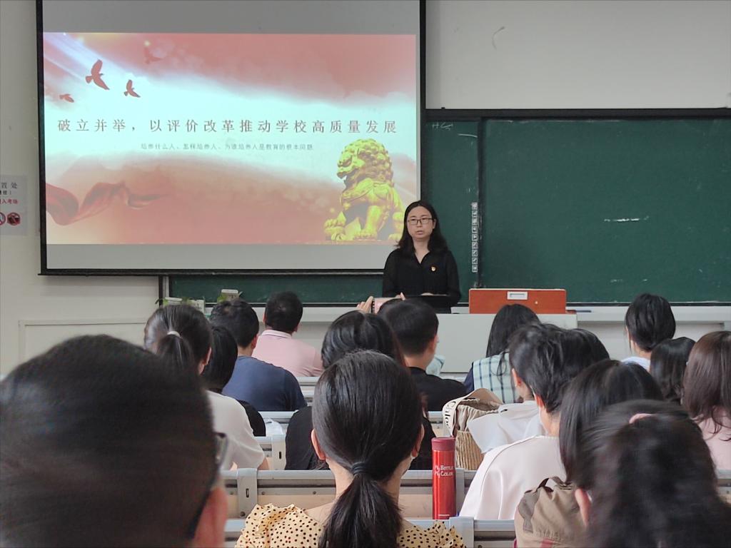 房朝君同志作了题为《破立并举,以评价改革推动学校高质量发展》的专题党课。她从新时代教育评价改革方向指引、新时代教育评价改革总体部署、新时代教育评价改革学校实践三个方面阐释我们应该培养什么人、怎样培养人、为谁培养人。她结合学校教育评价体系就如何完善教育评价体系、如何加快推进《深化新时代教育评价改革总体方案》落实落地提出了自己的想法;还从以评价改革牵引育人方式改革、以评价改革牵引办学模式改革、以评价改革牵引管理体制改革、以评价改革牵引保障机制改革四个方面阐释了如何进行新时代教育评价改革总体部署,并以学生评价改革为例,从学生、教师、学校三个维度,整体设计、系统重构、融合实施讲解我校从构建“学业+综合”多元评价体系、探索 “技术赋能”智慧评价途径和搭建“校内+校外”综合育人平台进行新时代教育改革。