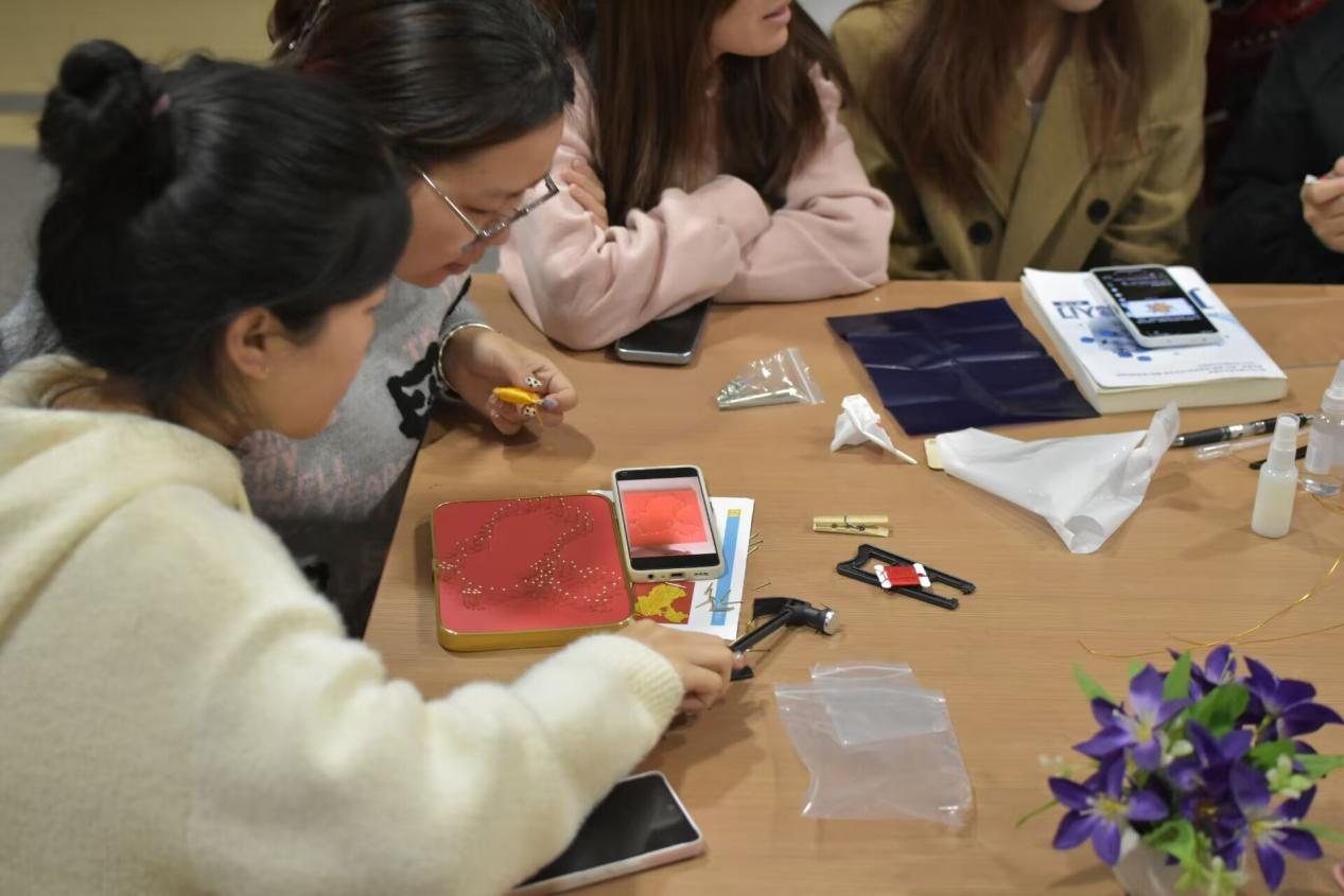 活动伊始,主持人袁因介绍了红船精神、剪纸的历史由来,并讲解本次手工的方法技巧以及注意事项。随后,同学们将掐丝珐琅画、钉子绕线画、手工剪纸等传统文化与红色文化相融合,设计制作天安门掐丝珐琅画、中国地图绕线画、井冈山革命圣地剪纸、南湖红船模型等手工作品,在一件件手工品的制作中重温了革命先辈们为国家抛头颅洒热血、激荡人心的故事,体味到如今幸福生活的来之不易。