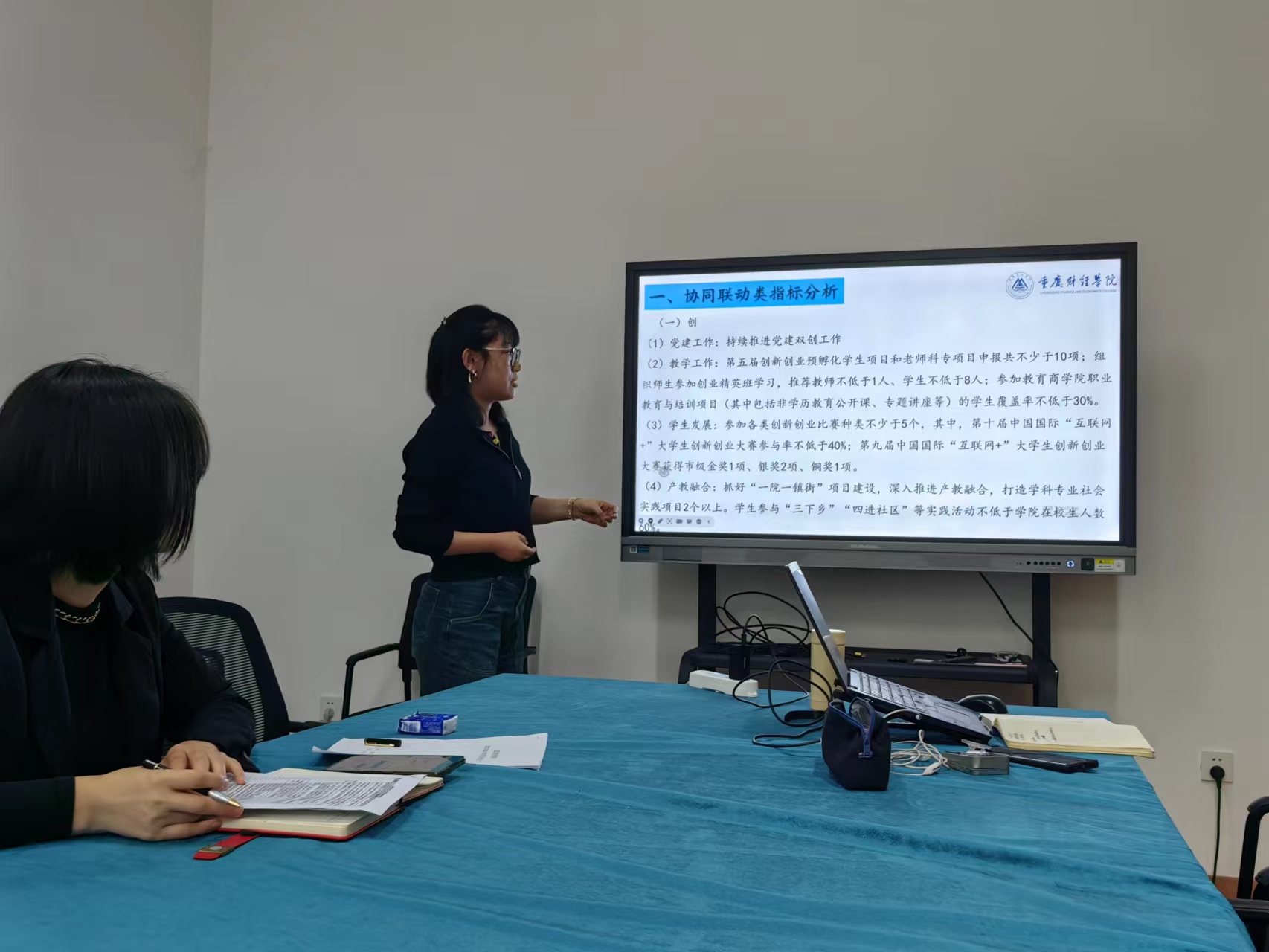 在会议中,李倩院长详细解读了目标责任书的内容,明确了各项指标和任务,并强调了全体师生在实现这些目标过程中的责任和使命。王婧婧副院长从“创、赛、文”三个方面明确了需要院内各岗位协同合作的重点和难点,并提出了工作思路。会议还就如何解决学生创新创业、产教融合、学科竞赛、师资引进等板块的难点进行了探讨;对如何提高学院的教学质量和学术水平进行了深入的讨论。