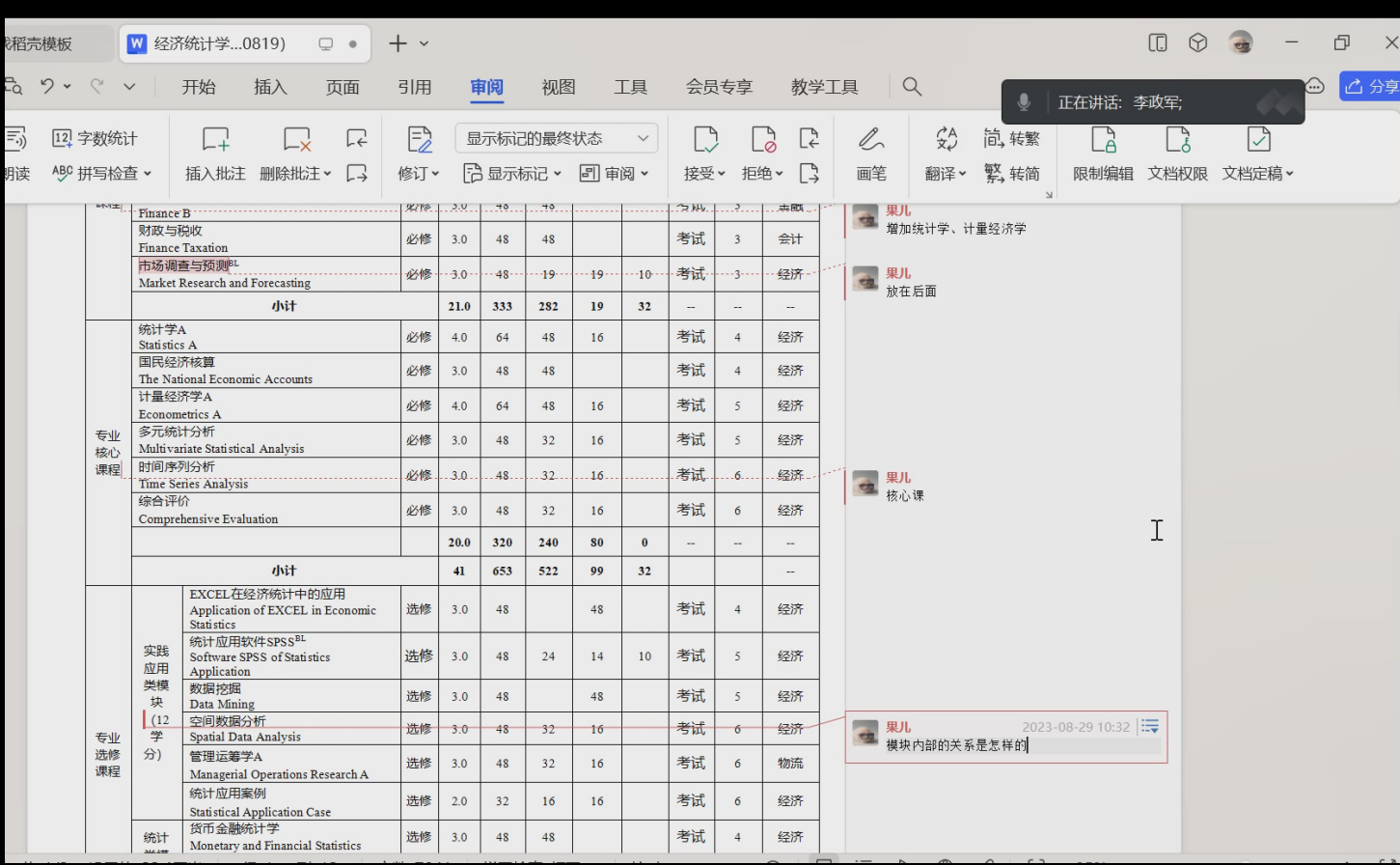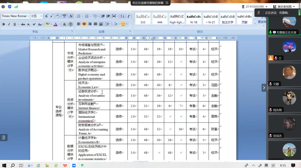 经济学专业苟靠敏、经济统计学专业马雨、数字经济专业张华、国际经济与贸易专业胡文静、贸易经济专业卢芳冰分别围绕调研报告、人培目标、课程体系、毕业要求及实现矩阵等方面对各专业的人才培养方案进行汇报。