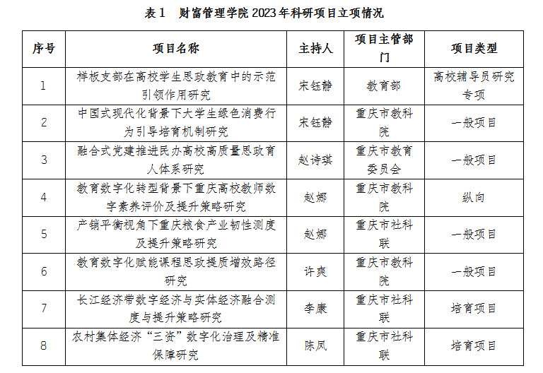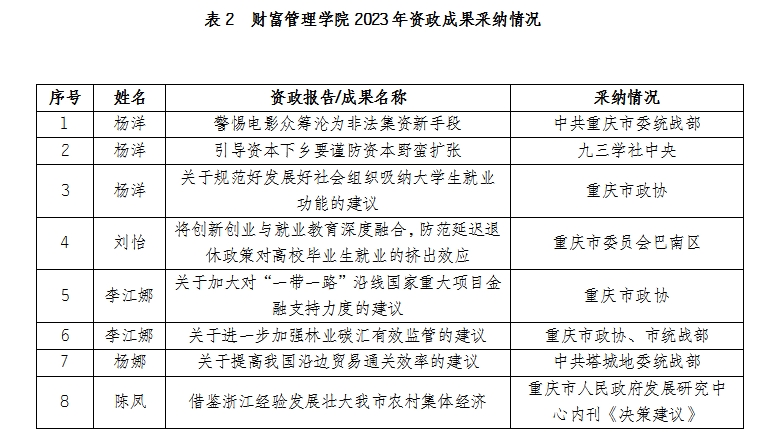 2023年,我校财富管理学院科研工作喜获丰收,成功立项8项省部级以上项目(表1),其中,1项教育部人文社会科学研究专项任务项目。发表期刊文章12篇(其中,A刊1篇、B刊1篇、C刊2篇、D刊1篇),8篇咨政建议成果被中共重庆市委统战部、重庆市政协、重庆市人民政府发展研究中心内刊《决策建议》、九三学社中央等采纳(表2)。其中,陈凤老师课题组撰写的资政建议《借鉴浙江经验发展壮大我市农村集体经济》,为我市人民政府发展研究中心(重庆社会科学院)《决策建议》首次刊发我校资政建议。