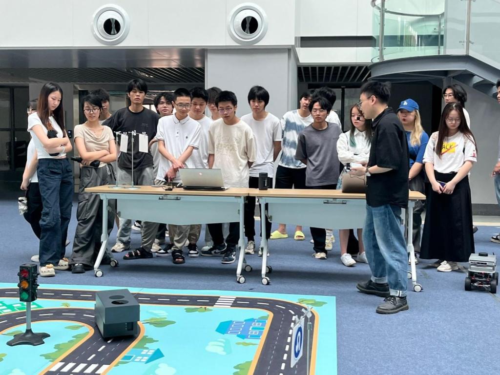 活动开始,工作人员向学生们介绍了由红外线识别、麦克拉姆轮胎、深度摄像头等部件构造而成的小型人工智能汽车,acc汽车以及搭载鸿蒙芯片的智能搬运机器人,并向我们解释了人工智能机器人的工作原理。随后,工作人员带领学生近距离参观智能汽车生产车间并详细介绍了各区域的分工,并参观了地铁和飞机实验室。