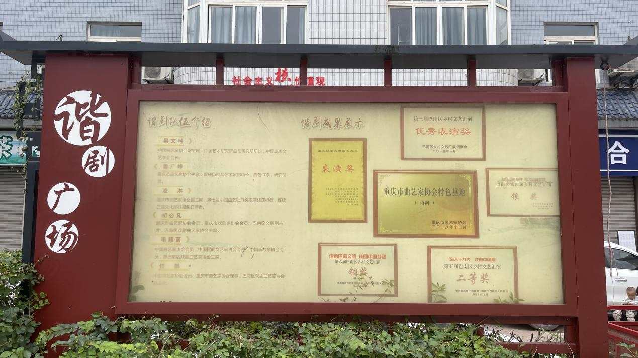 “一人独演,独演一人,一个人演一台戏,一人上场,满台生辉”。这是谐剧创始人王永梭先生对谐剧的生动描述。初入谐剧广场,通过牌匾,我们了解到:2015-2017年,惠民街道连续三年举办谐剧大赛;2018年重庆市曲艺家协会评为“重庆市曲艺家协会特色基地(谐剧)”;2019年在区文化艺术中心星光剧场成功举办“文化寻根,谐剧论坛”。这个小小的镇街,通过对自身的文化挖掘和创新,逐渐发展成为一个有着丰富文化特色的地区,最终被誉为“谐剧之乡”。惠民街道传承传统文化,做着很多人不知道的努力。惠民街道以谐剧为媒,以文化为魂,推进着中华优秀传统文化建设之路。