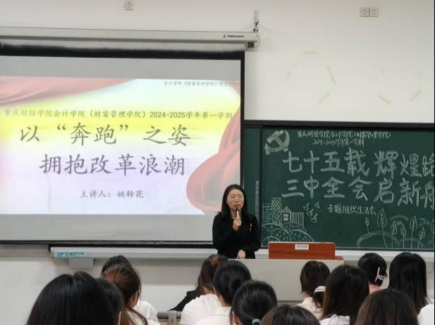 10月18日,学院学生党支部开展了专题组织生活会,各团支部也举办了全会精神主题活动,全体同学深入学习领会党的二十届三中全会精神要义,坚定听党话、跟党走的政治信念,把个人的理想同改革发展的浪潮紧密联系在一起,以全会精神转化为实际行动,切实做到学深悟透、知行合一。会计学院(财富管理学院)党总支书记姚转花表示,全体党员要“以‘奔跑’之姿,拥抱改革浪潮”,深入学习全会精神,明确自己的未来发展方向,不断提高自己的工作本领,积极进取、不断奋进。