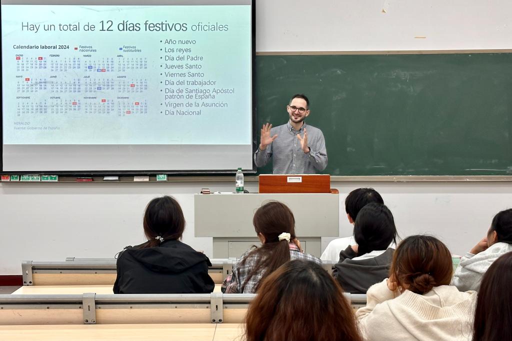 我校国际商学院为进一步落实1+X培养模式,以立德树人为根本的教育理念,提高学生综合素养,提升学科兴趣,10月31日下午,在教学楼1417教室继续开展了“国小商”特色精品系列活动“西班牙之韵”。本次活动由我校西班牙籍教师林海(Issac Martinez Banovio)担任主讲教师。