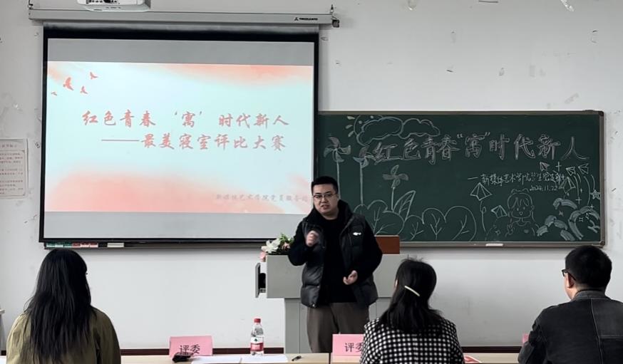 为深入学习贯彻党的二十届三中全会精神,有效发挥学生宿舍作为育人阵地的重要作用,进一步传承好红色基因,引导广大学生在宿舍建设中涵养文明新风、砥砺奋斗精神。11月22日中午,我校新媒体艺术学院党员服务站举行了“红色青春 寓时代新人”最美寝室风采大赛。学生组织联系领导干部、组织人事部副部长郑旺,学院党总支书记甘雪梅、学生支部书记封雨洁、学生支部组织委员张浩担任比赛评委。