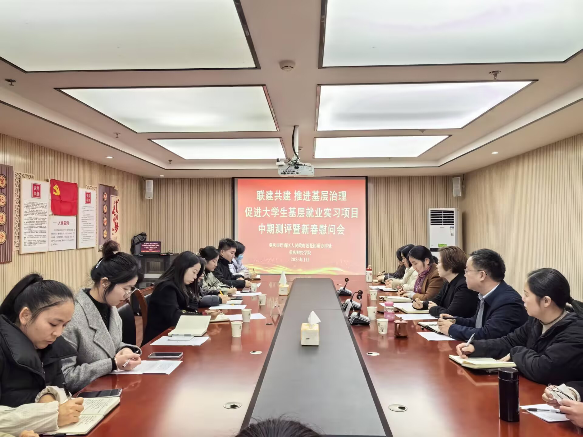 为切实做好“全面推进基层治理促进大学生基层就业实习项目”的中期评估考核工作,切实了解实习生的表现与成长情况,同时,在新春佳节即将来临之际,向同学们送上温暖关怀与诚挚问候,1月13日,团委书记夏文瑞、软件学院党总支副书记刘有沛、软件学院学团办主任王夏颖、软件学院专职辅导员陈红旭来到莲花街道召开实习项目中期测评暨新春慰问会。莲花街道党工委书记刁维娜、党工委专职副书记张东篱、党工委组织委员白秀英及村(社区)书记出席会议。