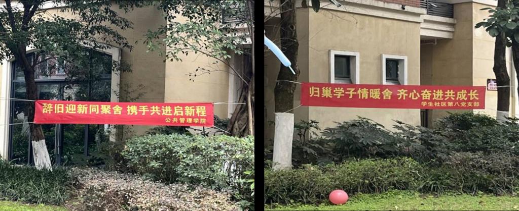 在7栋和13栋楼下,两条醒目的横幅迎风飘扬,标语“辞旧迎新同聚舍,携手共进启新程”和“归巢学子情暖舍,齐心奋进共成长”寄托了学院对同学们新学期的美好祝愿。楼栋大门用五彩缤纷的气球装饰,道路两旁的草木也披上了拉花,整个宿舍区洋溢着喜庆与活力的气息。