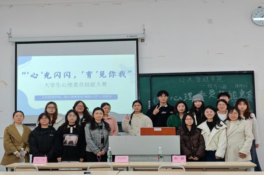 为提升学院心理委员的专业素养与实践能力,进一步筑牢校园心理健康防线,3月12日,我校公共管理学院“倾听心语”心理驿站于教学楼1313、1314教室举办“心理委员技能大赛”。学院党总支书记罗婷婷、团总支书记阳圆、全体专职辅导员,及数名心理委员共同参与活动。