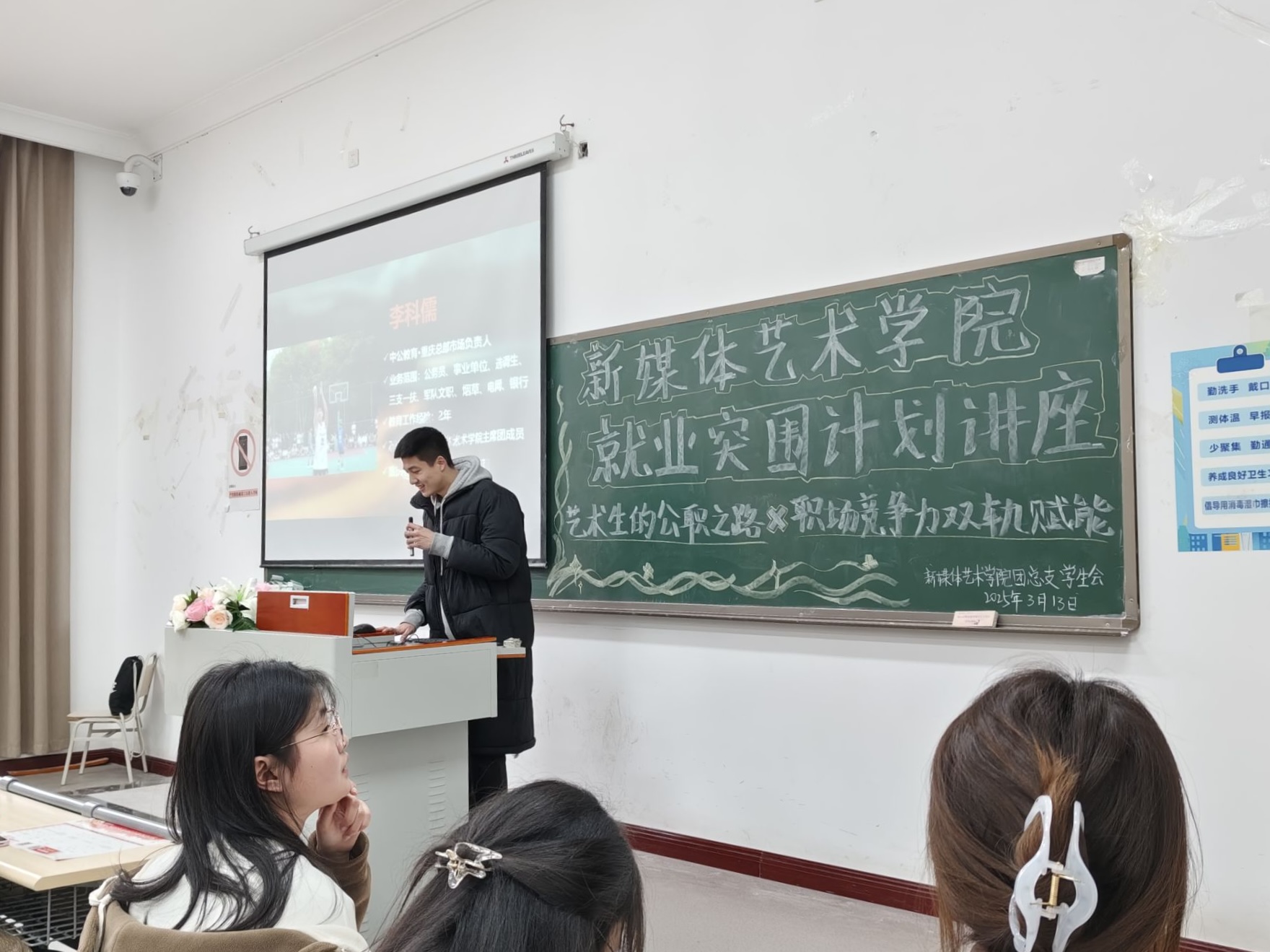 为帮助艺术类学子拓宽就业视野,提升职场竞争力,3月13日,我校新媒体艺术学院在教学楼1420教室举办“公职之路×职场竞争力”双轨赋能讲座。本次活动聚焦艺术生专属发展路径,通过系统化指导搭建职业发展立交桥。