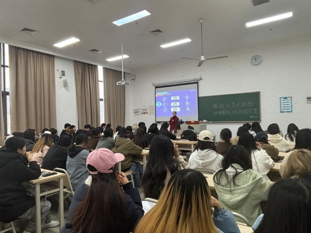 为帮助2026届学生全面了解考研形势,提高考研积极性、增强考研信心、激发考研斗志,同时更加深入了解学科专业状况,3月11日,我校新媒体艺术学院在教学楼1513教室开展考研专题讲座。本次讲座特邀专业指导黄老师为同学们进行考研全程规划讲解,学院党总支书记甘雪梅、年级组长袁媛以及2022级100余名学生参加。