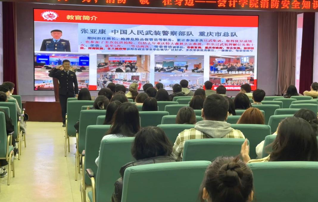 为进一步提升大学生消防安全意识和自防自救能力,强化消防安全风险防范,切实筑牢消防安全的生命线,3月12日,我校会计学院(财富管理学院)在学术报告厅举办消防安全知识宣讲会,讲座由重庆利民消防中心张亚康教官主讲,学院党总支书记姚转花、学团办主任、全体专职辅导员、各寝室长及学生代表参加。