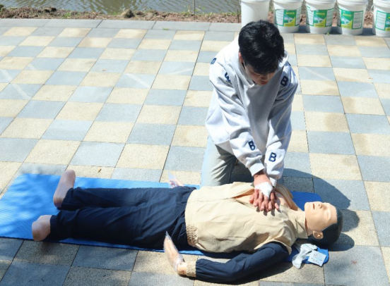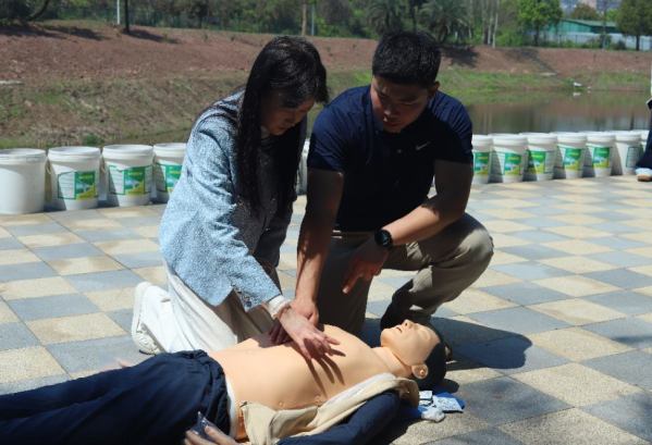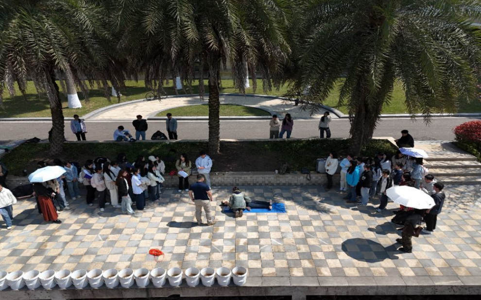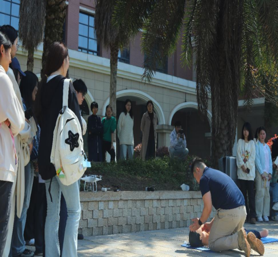 在急救技能实操环节,应急救援员谢崇林、杨春等通过生动的情景模拟,生动地向师生们展示了心肺复苏、气道梗阻处理、创伤包扎等关键技能,并指导参与者分组实践。参与者袁乙元同学感慨地说:“亲自制作担架、学习包扎技巧,让我深刻认识到应急救援的严谨性。科技与技能、专业与实践的融合,为生命赢得了更多希望。”师生们积极参与实操环节中,共同练习急救技巧,这种互动式教学使同学们在实践中熟练掌握了急救技能,有效提升了大家的自救互救能力。