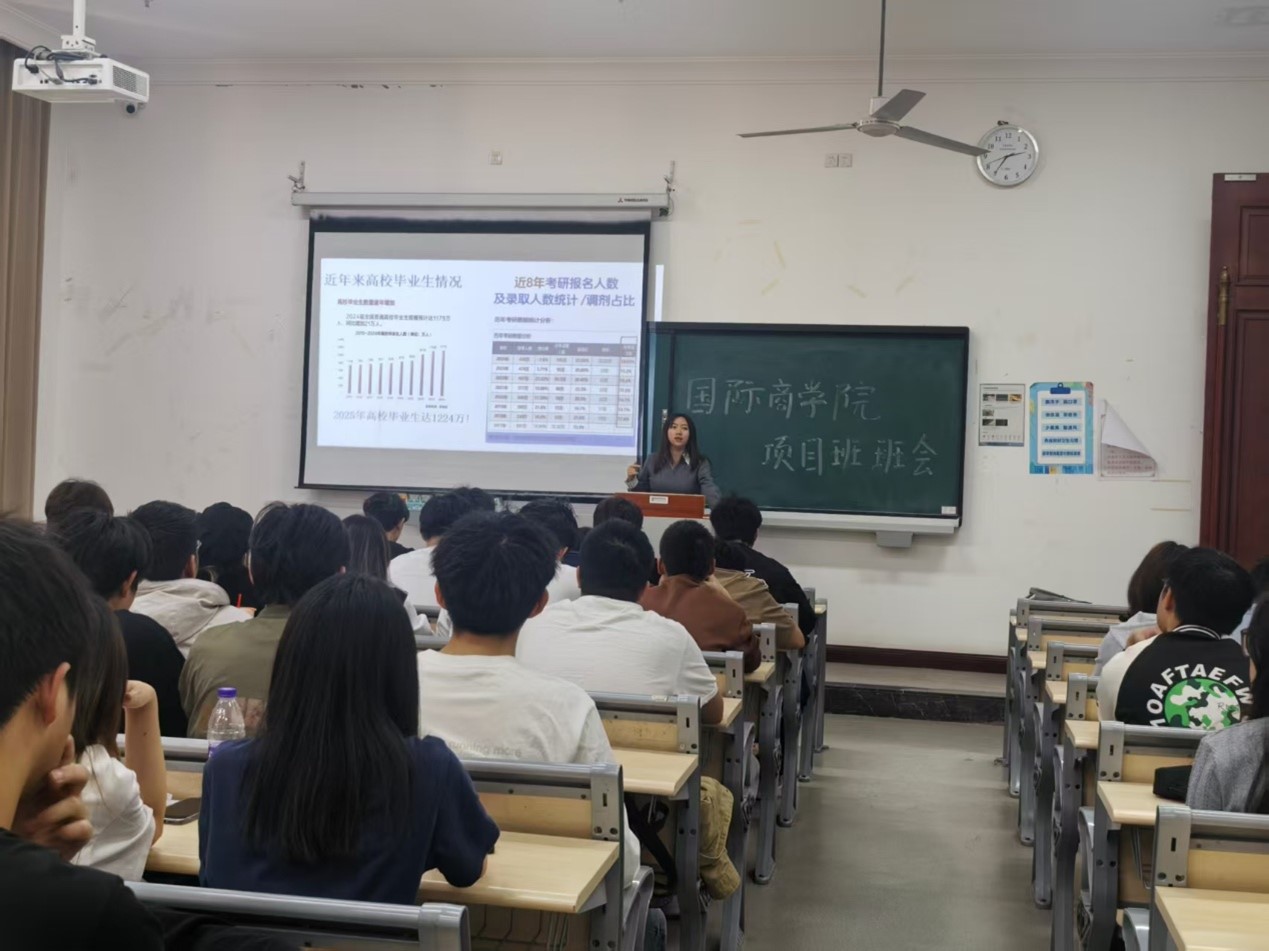 聚焦学风建设,打造留学规划。国际商学院于3月26日下午,在教学楼1306开展项目班班会。本次会议由国际商学院辅导员李倩主持,项目老师李潇潇进行宣讲,学院23和24级全体项目班学生参加。通过师生互动与专业讲解,为学生拓展国际视野、明确学业目标提供了重要指导。
