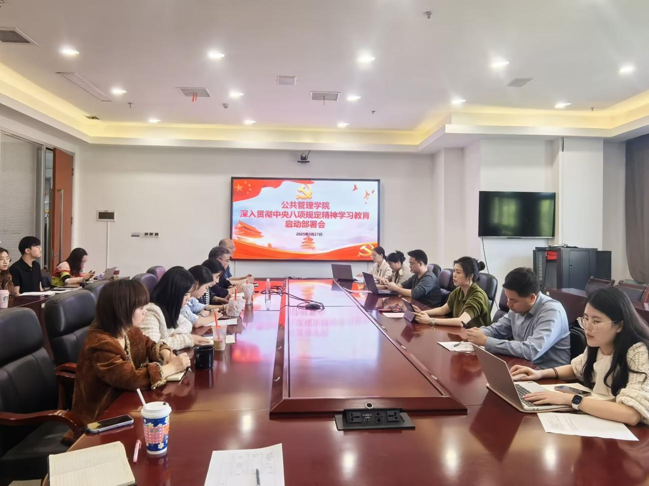 为深入贯彻落实党中央和学校党委关于中央八项规定精神学习教育部署要求,推进作风建设常态化长效化,3月27日,我校公共管理学院召开深入贯彻中央八项规定精神学习教育启动会。会议围绕贯彻中央八项规定精神,系统部署学院作风建设工作,推动学习教育落地见效。学院领导班子全体成员、全体教师党员参加会议,会议由学院党总支书记罗婷婷主持。