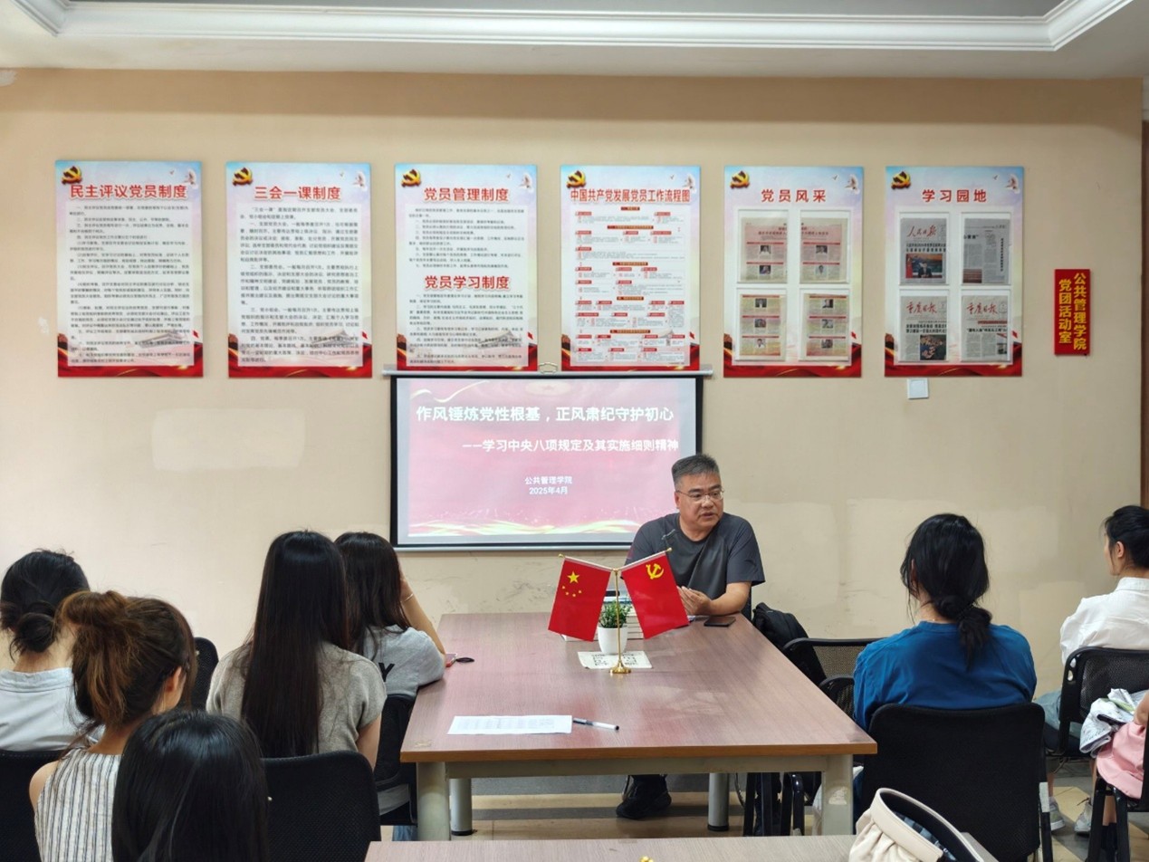 为深入贯彻党的二十届三中全会精神,持续推进习近平新时代中国特色社会主义思想主题教育成果落实落地,4月17日,我校公共管理学院学生社区党支部在七栋党团活动室举办了“教师讲堂进社区”系列活动的第二场专题活动。本次活动特别邀请教师党员尚游同志,为师生们讲授中央八项规定精神学习教育专题党课,引领支部成员筑牢党性根基,捍卫廉洁底线,推动“一站式”学生社区建设。