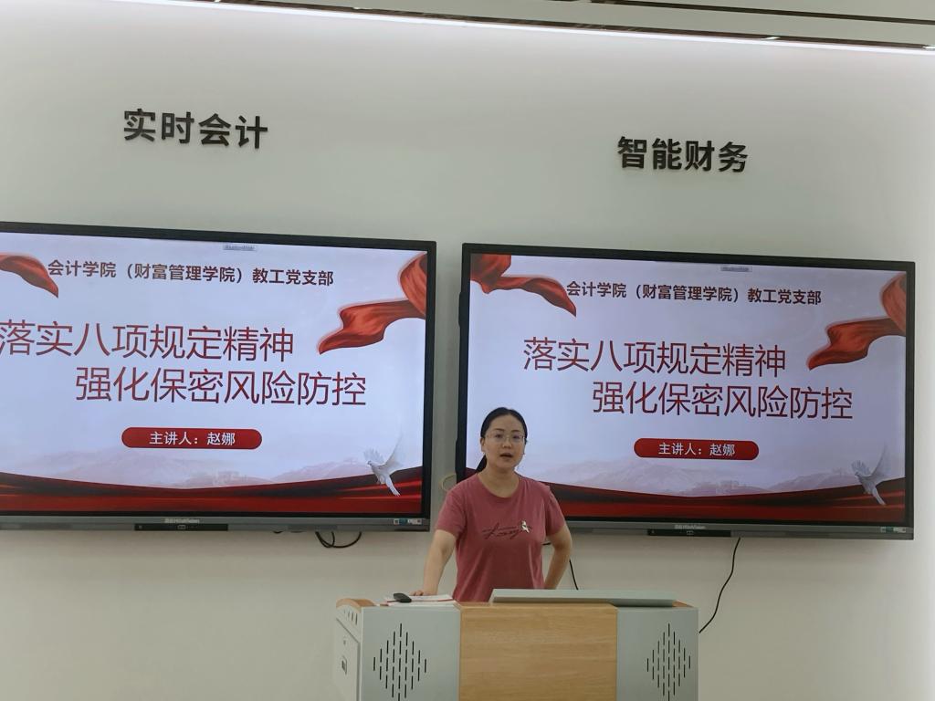 为深入贯彻落实全面从严治党要求,持续强化党员干部纪律意识,扎实推进中央八项规定精神学习教育工作走深走实。5月29日,会计学院(财富管理学院)教工党支部在行政楼1206教室召开深入贯彻中央八项规定精神专题学习会。会议以“深学八项规定精神,砥砺践行使命担当”为主题,通过专题学习、重点发言、交流研讨等形式,推动“中央八项规定精神”学习入脑入心。