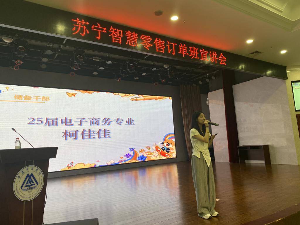 此外,活动现场还特别邀请了2025届电子商务专业优秀学生柯佳佳分享工作经历。她结合自身在苏宁易购的成长过程,讲述了从入职初期的适应,到逐步胜任岗位职责的心路历程,并就求职过程中的常见问题给予学弟学妹们中肯建议。