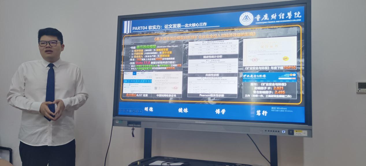 周恒屹以我校申请G5院校为例分析申请留学核心要素中硬实力(标准化)和软实力。他表示,在硬实力中,要获得GPA90均分,除了努力认真学习,还需要加强和老师互动和沟通。在软实力方面,竞赛丰厚的奖项是申请留学考察重点也是重财学子可以实现的目标,他指出,优秀团队成员同磁共振是他获得国家级竞赛7项,省部级12项的关键因素。通过实习收获经验和数据,并在贺晗院长悉心指导发表了中文核刊,以此为契机,发表中英文4篇文章,成为个人软实力一大亮点。最后,周恒屹指出,逐梦过程中校友榜样示范作用和提供咨询帮助也是一个非常重要因素。CFA班陈旭欧(伦敦政经学院)、陈炳旭(香港中文大学)、周依琳(伦敦政经学院)等学姐学长们的实际,让他相信,只要肯努力梦就会实现。
