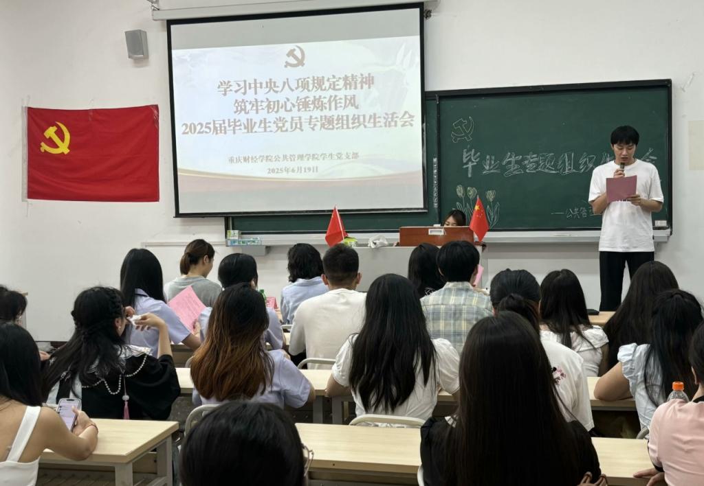 6月19日,我校公共管理学院召开2025届毕业生党员专题组织生活会,主题为“学习中央八项规定精神,筑牢初心锤炼作风”。会议由学生党支部组织委员李士家主持,学院党总支书记罗婷婷、学生党支部书记王春凤、党总支专职组织员王芹及学生党支部全体毕业生党员参加。