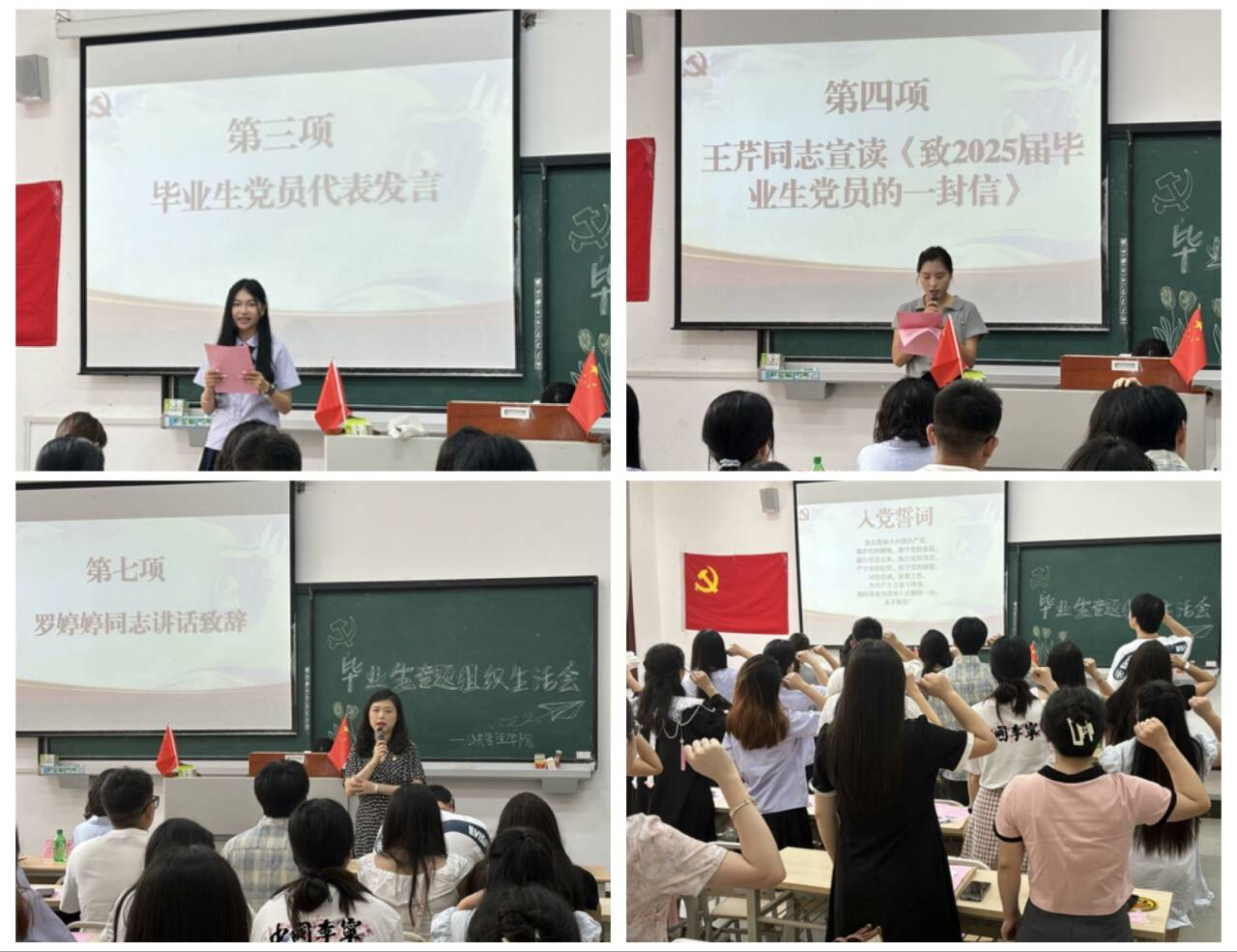 王芹宣读《致2025届毕业生党员的一封信》,信中对毕业生党员们提出了殷切期望。罗婷婷高度赞扬毕业生党员在校期间的优异表现,寄语毕业生党员在新征程中继续发扬党的优良传统,严格执行中央八项规定,廉洁自律,以身作则,以优良作风展现党员风采,为实现中华民族伟大复兴的中国梦贡献青春力量。