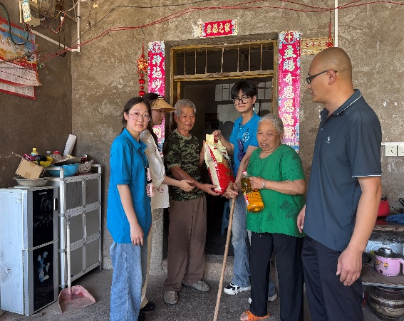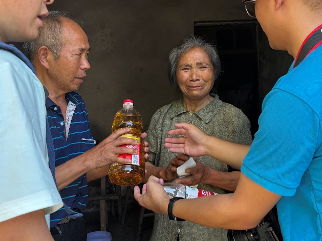 精准聚焦需求,传递物质温情。实践团还为每户家庭送上了大米和食用油,一袋袋饱含心意的大米,一桶桶承载关怀的食用油,不仅是解决眼前生活所需的实用物资,更是传递了实践团对乡村困难群体的深切挂念和社会温情。面对这份来自远方的真挚关怀,爷爷奶奶们难掩内心的激动与喜悦。一位奶奶紧紧握着学生的手,声音哽咽:“党和政府好,你们这些大学生娃娃也好,大热天跑这么远来看我们,还带这些东西……”情到深处,老人的眼眶不禁湿润,朴实的言语中饱含着对政府关怀和实践团关爱的由衷感激。