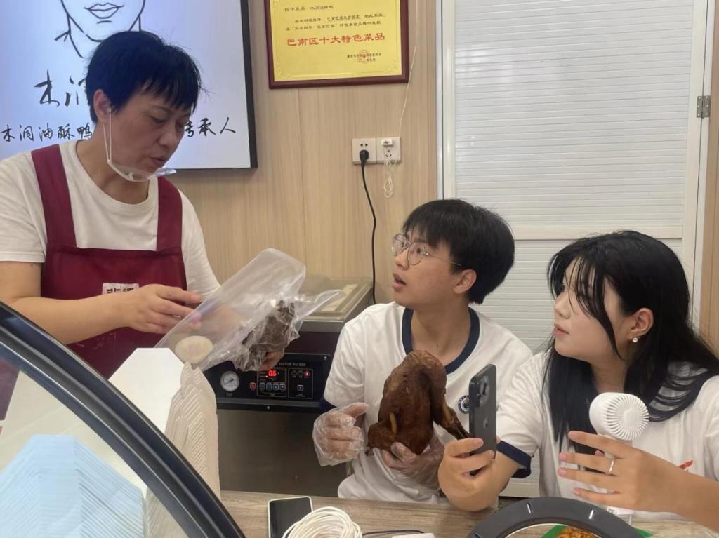 在木洞油酥鸭店铺内,志愿者们化身“文化推介官”,通过直播平台生动讲述油酥鸭背后的非遗故事。“家人们快看!这金黄酥脆的木洞油酥鸭正在滋滋冒油!”主播们举起刚出炉的油酥鸭,酥脆的外皮在镜头前闪闪发亮,“每一只都要经过18道传统工艺,整整48小时秘制,这味道绝了!”