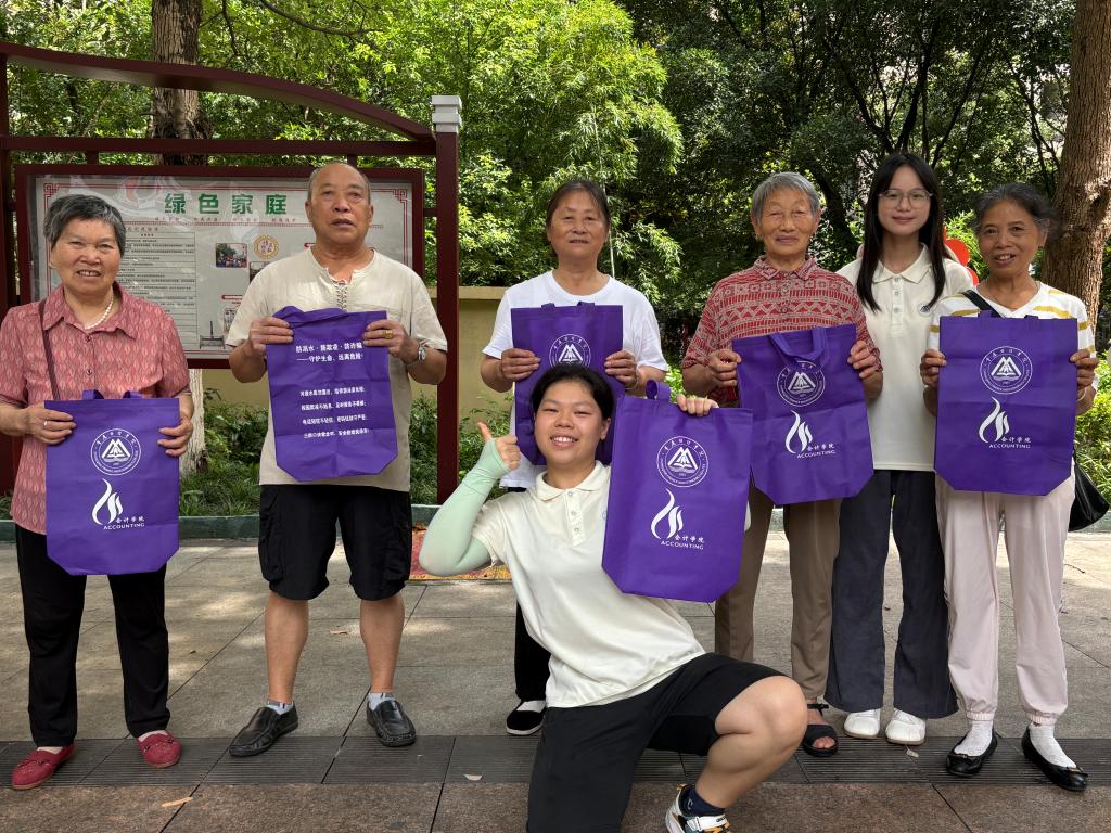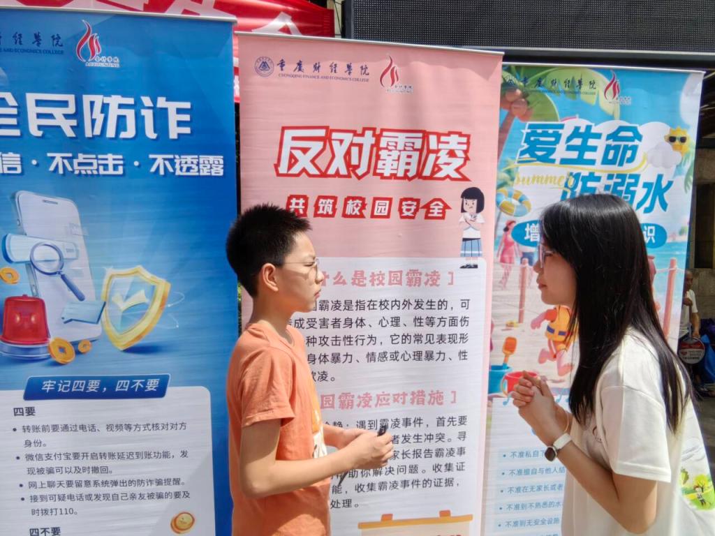 “三防”知识宣传同样精彩纷呈。团队设计的宣传手提袋兼具实用与教育功能,防溺水“六不准”、反诈“五不原则”等要点清晰印于袋上,成为行走的“安全指南”。针对暑期溺水高发,成员们用动画讲解自救互救方法;面对多样诈骗手段,以刷单返利、冒充公检法等案例还原套路,提醒老年群体守好 “养老钱”;此外,团队还开设了“防霸凌小课堂”,通过互动游戏教会孩子们如何保护自己,在轻松愉快的氛围中传递安全知识