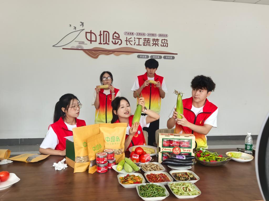 镜头下,中坝岛的丰饶水土孕育的生态蔬果悉数亮相:沙瓤番茄晶莹剔透、酸甜汁盈,水果玉米翠嫩如玉、爽脆甘甜,现摘花生粒粒饱满、唇齿留香。紫茄油亮、豇豆修长、苦瓜清苦回甘、辣椒鲜辣劲爽…构成一幅生动的江岛蔬香图景。尤为引人瞩目的是以当日采摘番茄熬制的特色“番茄底料”,其鲜红色泽与浓郁风味,成为直播间“爆款”。 志愿者们通过沉浸式品鉴与场景化解说,生动传递“番茄爆汁沁爽”、“生啃玉米似水果”的直观体验。团队同步科普中坝岛富硒土壤环境与生态种植技术,将直播间化为一场“从田间到云端”的鲜活蔬宴,吸引了众多网友在线关注与踊跃互动,直播间气氛热烈。