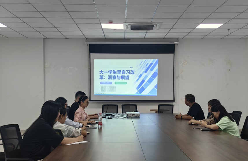 会议首项聚焦早自习改革—— 该工作已由 24 级辅导员团队率先推进,形成课堂出勤、早自习参与度、学生满意度等一手数据。会上,尚栋老师作专题报告,阐述改革背景、路径及成效(24 级学生改革后满意度提升 20%+);马秋婵老师补充分层督导、个性化辅导等实操细节。