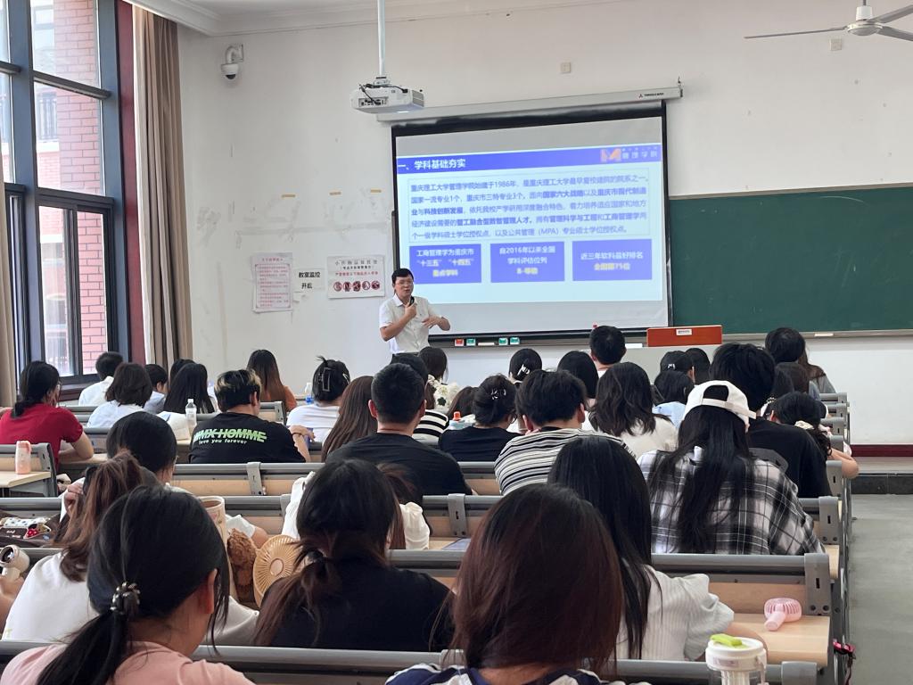 宣讲会上,副院长周林以“为什么读研”破题,从个人价值、知识结构、职业发展与时代机遇四维度阐释读研意义,鼓励学生将个人成长融入国家发展需要。在随后的“靠谱的电子游戏平台官网”与“学院简介”环节,他系统介绍了重庆理工大学作为工科优势突出的市属重点大学的办学实力,并着重展示了管理学院在师资力量、科研成果与实践平台等方面的综合优势,凸显其培养创新型管理人才的坚实基础。