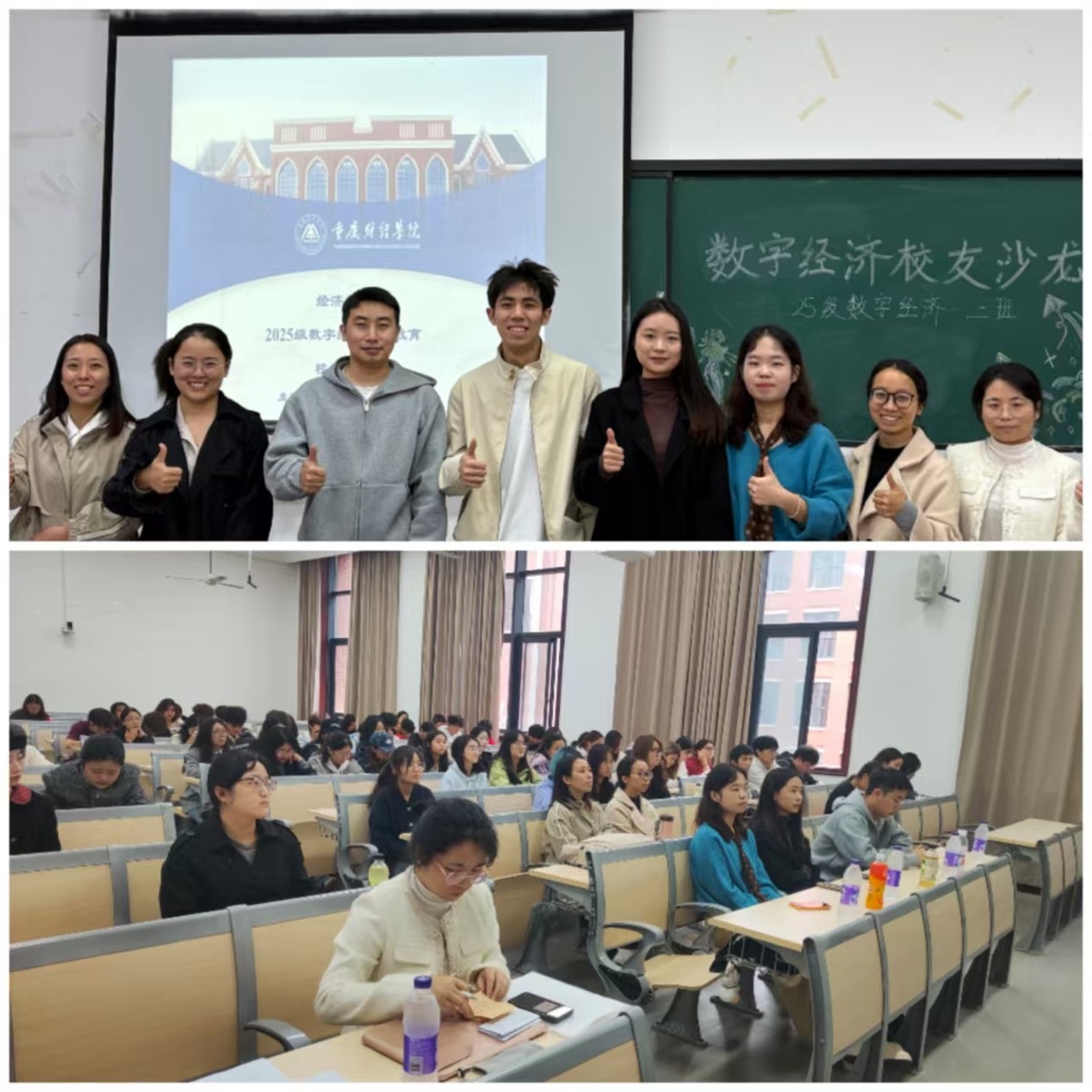 2025111日下午,经济学院数字经济专业2025级新生专业认知教育系列活动之校友沙龙在教学楼1306教室顺利举行。本次活动旨在帮助2025级普通本科与专升本新生尽快适应大学学习生活,增强专业认同,明晰职业发展方向。沙龙由经济统计系教师王利娟组织并主持,数字经济专业教师刘云飞、李梨,2025届辅导员左小容老师,以及全体2025级数字经济专业本科新生和专升本新生共同参与。活动采用线上线下融合模式,共吸引278名师生参加,现场气氛热烈,交流深入。