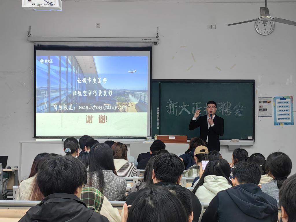 现场,潘云峰经理围绕新大正机场物业核心竞争力展开分享,提及集团服务覆盖全国23个核心机场,包括北京大兴、广州白云、重庆江北等标杆项目,构建了基础服务与航空特色服务体系,其中客舱保洁、飞行区安全保障等特色服务是核心优势。同时,他介绍了集团“阶梯式培养体系”:为低年级设认知实践营、为大三学生提供暑期实习、应届生可通过管培生计划成长,让学生清晰职业进阶路径。